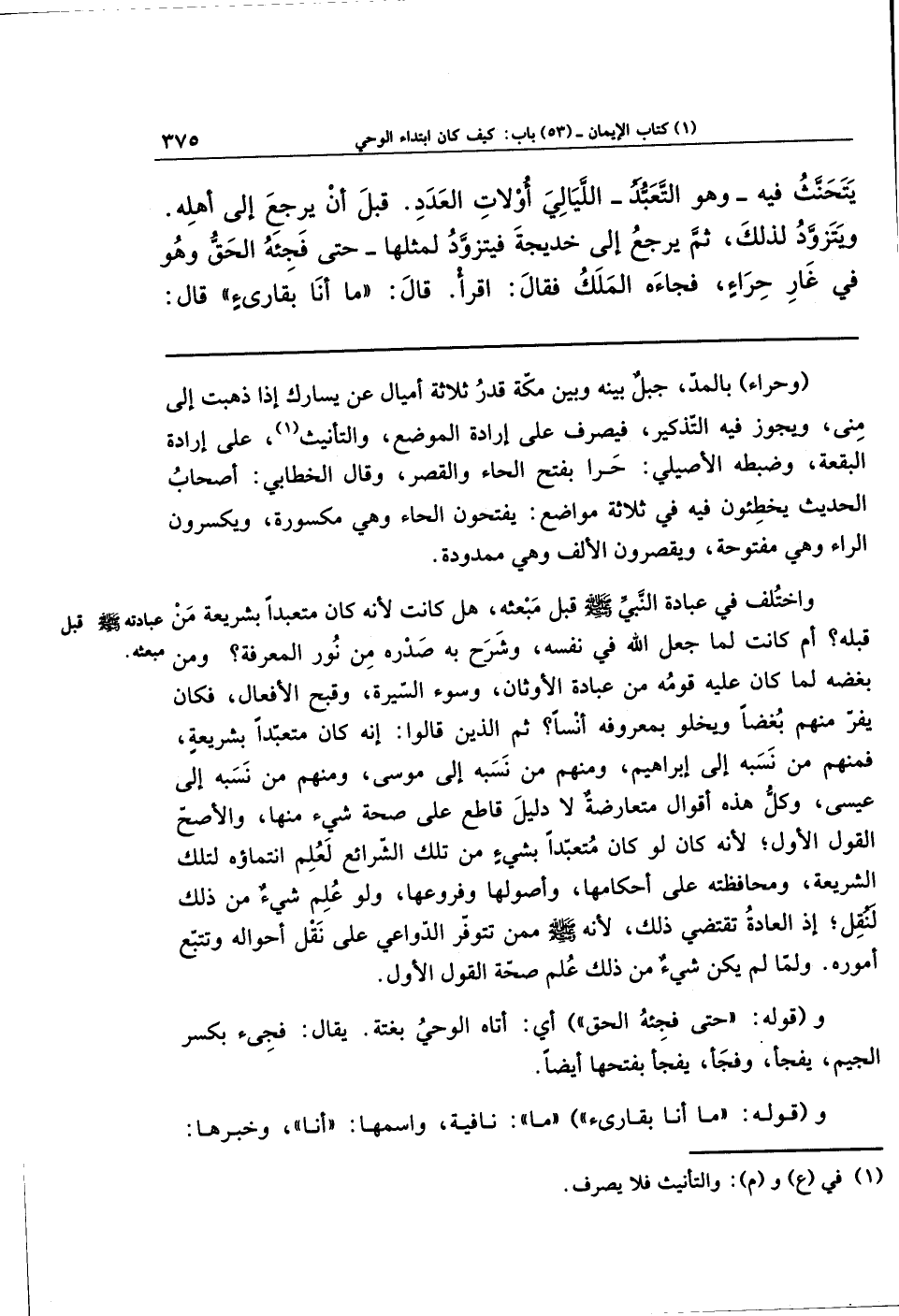واختُلِف في عبادة النبيّ - صلى الله عليه وسلم - قبل مبعثه، هل كانت لأنّه كان متعبِّدًا بشريعة مَن قبله؟ أم كانت لِمّا جعل الله في نفسه وشرح به صدره من نور المعرفة؟ ومن بغضه لِما كان عليه قومه من عبادة الأوثان وسوء السيرة وقبح الأفعال، فكان يفرّ منهم بُغضًا ويخلو بمعروفه أُنسًا؟