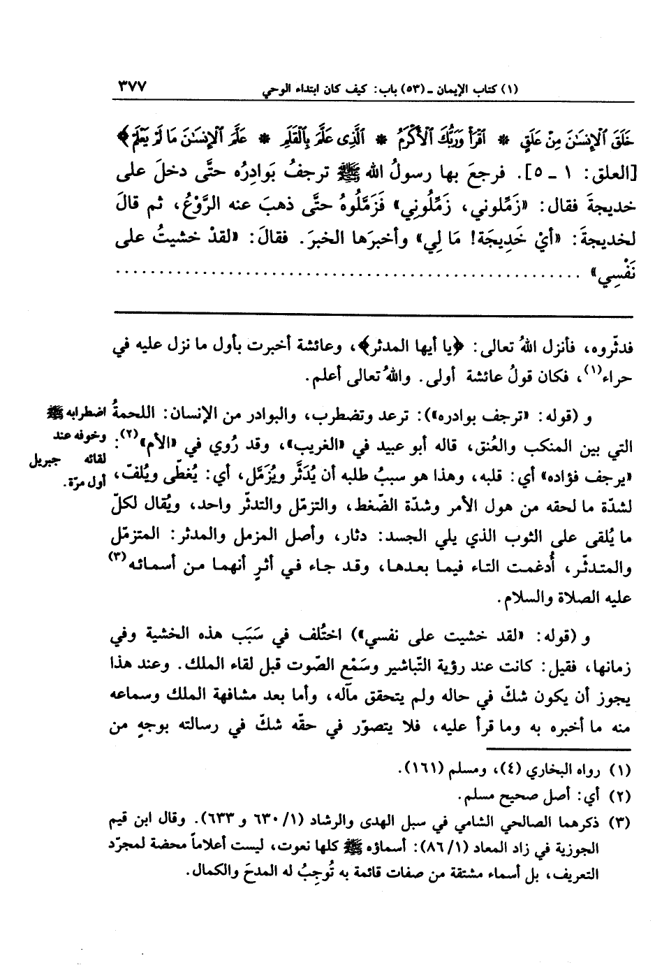 خَلَقَ الإِنسَانَ مِن عَلَقٍ اقرَأ وَرَبُّكَ الأَكرَمُ الَّذِي عَلَّمَ بِالقَلَمِ عَلَّمَ الإِنسَانَ مَا لَم يَعلَم. فَرَجَعَ بِهَا رَسُولُ اللهِ - صلى الله عليه وسلم - تَرجُفُ بَوَادِرُهُ، حَتَّى دَخَلَ عَلَى خَدِيجَةَ، فَقَالَ: زَمِّلُونِي، زَمِّلُونِي. فَزَمَّلُوهُ حَتَّى ذَهَبَ عَنهُ الرَّوعُ، ثُمَّ قَالَ لِخَدِيجَةَ: أَي خَدِيجَةُ! مَا لِي؟ وَأَخبَرَهَا الخَبَرَ، فقَالَ: لَقَد خَشِيتُ عَلَى نَفسِي،