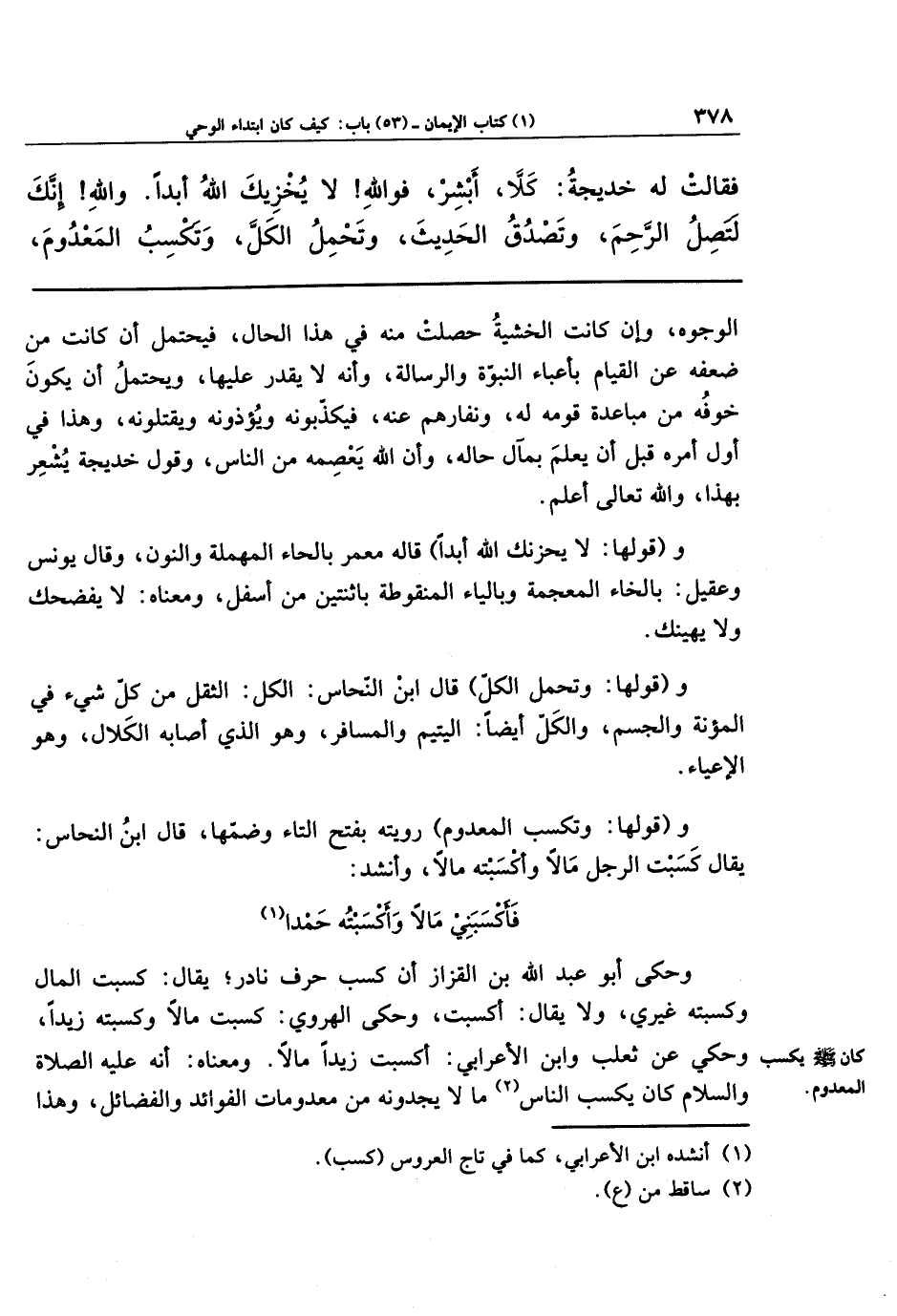 فقَالَت لَهُ خَدِيجَةُ: كَلاَّ! أَبشِر، فَوَاللهِ! لا يُخزِيكَ اللهُ أَبَدًا. وَاللهِ! إِنَّكَ لَتَصِلُ الرَّحِمَ، وَتَصدُقُ الحَدِيثَ، وَتَحمِلُ الكَلَّ، وَتَكسِبُ المَعدُومَ،