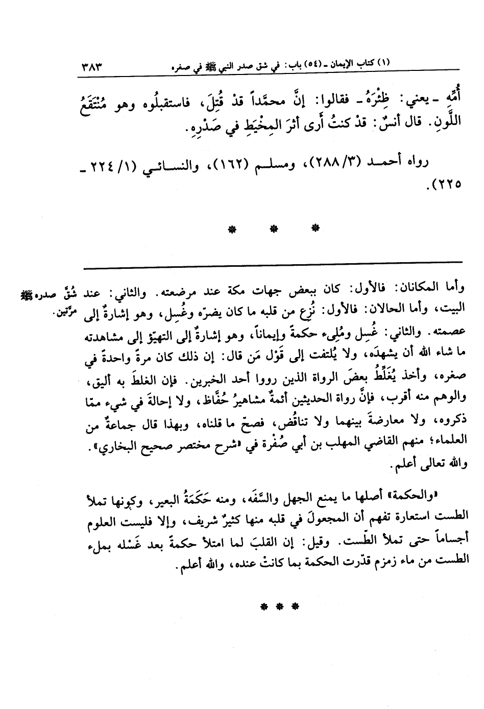وأمّا المكانان، فالأوّل كان ببعضِ جهات مكّة عند مُرضِعته، والثاني عند البيت. وأمّا الحالان، فالأوّل نُزِعَ من قلبه ما كان يَضُرُّه وغُسِل، وهو إشارة إلى عصمته، والثاني غُسِل ومُلِئ حكمةً وإيمانًا، وهو إشارة إلى التهيُّؤ إلى مشاهدته ما شاء الله أن يشهده. ولا يلتَفِت إلى قول مَن قال: إنّ ذلك كان مرّةً واحدة في صِغَرِه، وأخذ يُغَلِّط بعض الرواة الذين رووا أحد الخبرين، فإنّ الغلط به أليق، والوَهم منه أقرب، فإن رواة الحديثين أئمّةٌ مشاهير حُفَّاظ. ولا إحالةَ في شيء ممّا ذكروه، ولا معارضةَ بينهما ولا تناقُضَ، فصحّ ما قلناه. وبهذا قال جماعة من العلماء، منهم القاضي المُهلَّب بن أبي صُفرة في شرح مختصر صحيح البخاريّ. والله تعالى أعلم.