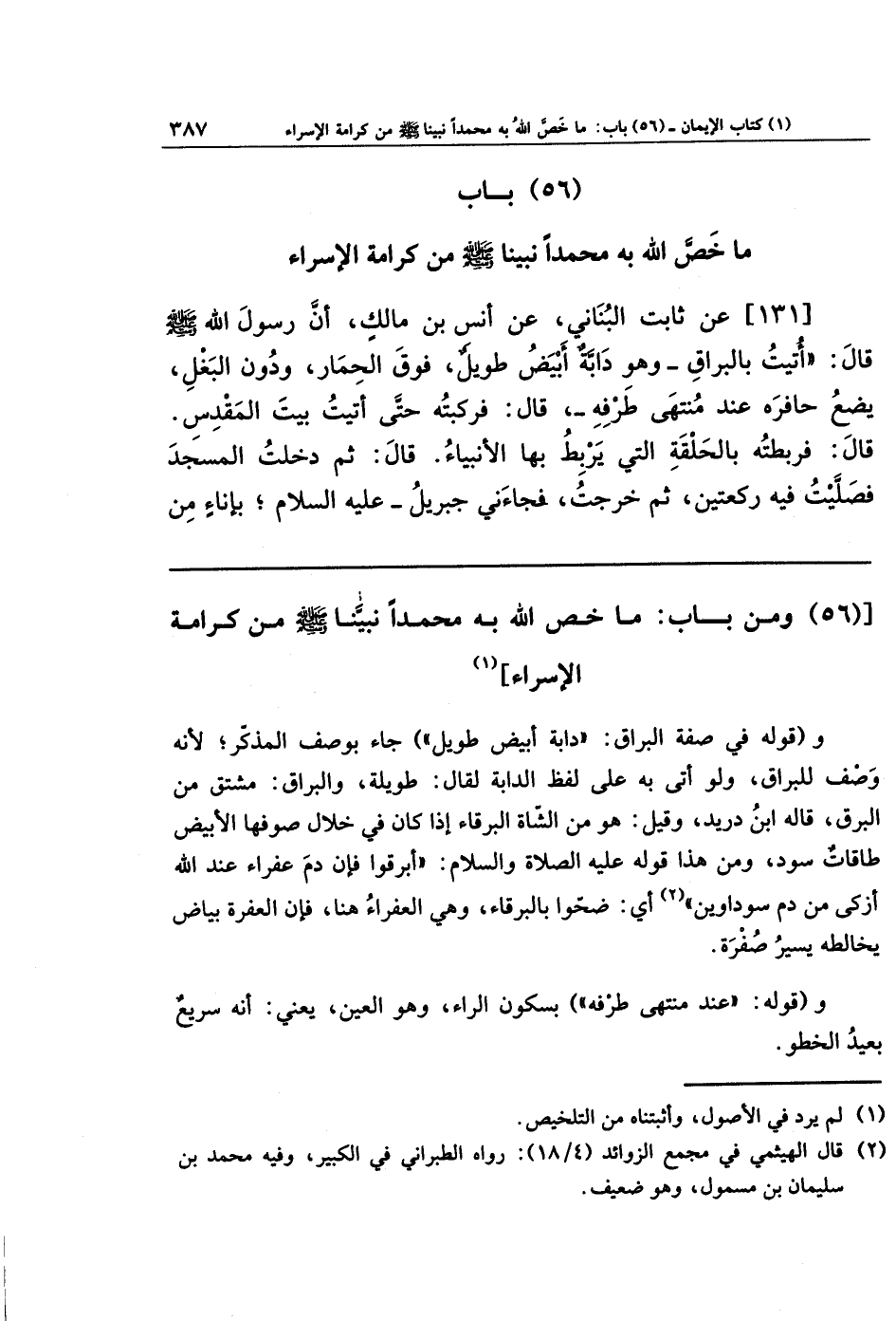 [131] عَن ثَابِتٍ البُنَانِيِّ، عَن أَنَسِ بنِ مَالِكٍ؛ أَنَّ رسولَ الله - صلى الله عليه وسلم - قَالَ: أُتِيتُ بِالبُرَاقِ - وهو دَابَّةٌ أَبيَضُ طَوِيلٌ، فَوقَ الحِمَارِ، وَدُونَ البَغلِ، يَضَعُ حَافِرَهُ عِندَ مُنتَهَى طَرفِهِ -. قَالَ: فَرَكِبتُهُ حَتَّى أَتَيتُ بَيتَ المَقدِسِ. قَالَ: فَرَبَطتُهُ بِالحَلقَةِ الَّتِي يَربِطُ بِها الأَنبِيَاءُ. قَالَ: ثُمَّ دَخَلتُ المَسجِدَ فَصَلَّيتُ فِيهِ رَكعَتَينِ، ثُمَّ خَرَجتُ، فَجَاءَنِي جِبرِيلُ - عليه السلام - بِإِنَاءٍ مِن