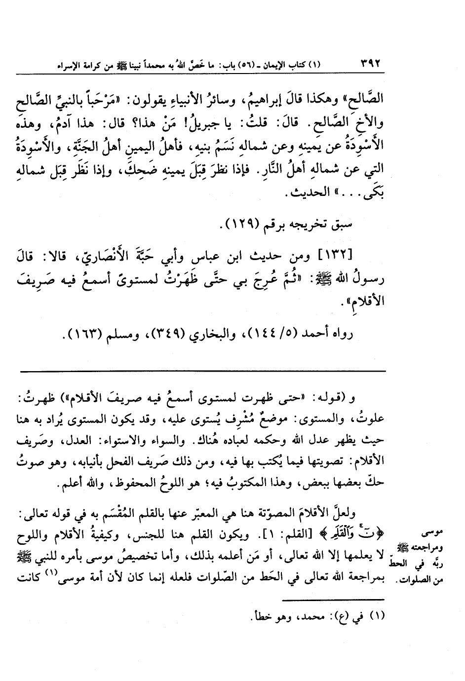 ولعلّ الأقلام المصوِّتة هنا هي المعبَّر عنها بالقلم المُقسَم به في قوله تعالى: ن وَالقَلَمِ ويكون القلم هنا للجنس. وكيفية الأقلام واللوح لا يعلمها إلاّ الله تعالى أو من أعلمه بذلك. وأمّا تخصيص موسى بأمره للنبيّ - صلى الله عليه وسلم - بمراجعة الله تعالى في الحطّ من الصلوات، فلعلّه إنّما كان لأنّ أمّة موسى (¬1) كانت