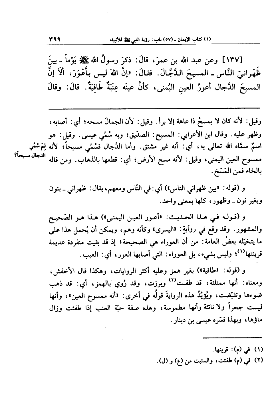 [137] وَعَن عَبدِ اللهِ بنِ عُمَرَ، قَالَ: ذَكَرَ رَسُولُ اللهِ - صلى الله عليه وسلم يَومًا بَينَ ظَهرَانَيِ النَّاسِ - المَسِيحَ الدَّجَّالَ، فَقَالَ: إِنَّ اللهَ لَيسَ بِأَعوَرَ، أَلا إِنَّ المَسِيحَ الدَّجَّالَ أَعوَرُ العَينِ اليُمنَى، كَأَنَّ عَينَهُ عِنَبَةٌ طَافِيَةٌ. قَالَ: وَقَالَ