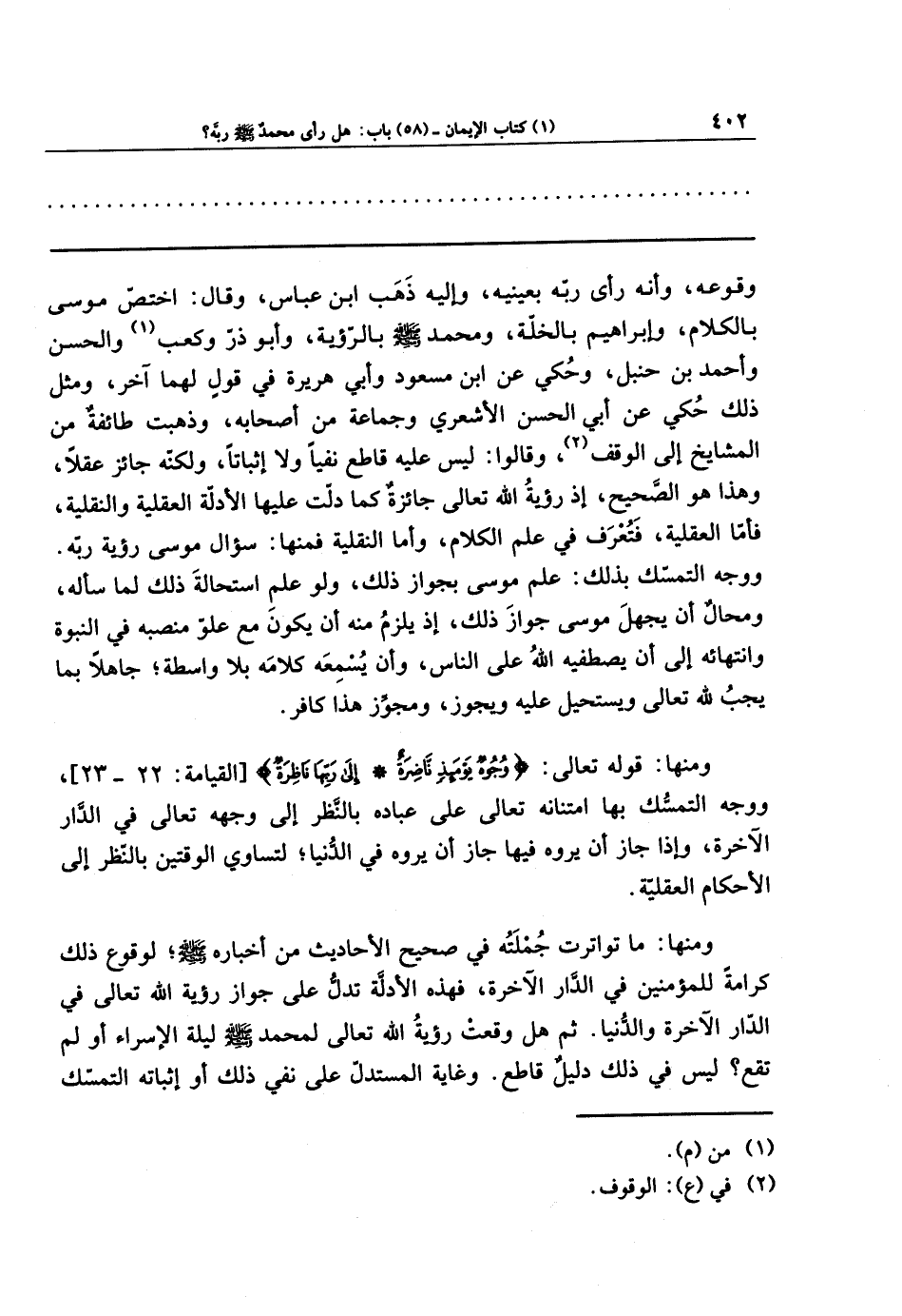 وذهبت طائفة من المشايخ إلى الوقف (¬2)، وقالوا: ليس عليه قاطع نفيًا ولا إثباتًا، ولكنه جائز عقلاً، وهذا هو الصحيح؛ إذ رؤية الله تعالى جائزة كما دلّت عليها الأدلة العقلية والنقلية، فأما العقلية، فتعرف في علم الكلام. وأما النقلية فمنها سؤال موسى رؤية ربه، ووجه التمسّك بذلك علم موسى بجواز ذلك، ولو علم استحالة ذلك، لما سأله، ومحال أن يجهل موسى جواز ذلك؛ إذ يلزم منه أن يكون مع علو منصبه في النبوة، وانتهائه إلى أن يصطفيه الله على الناس، وأن يُسمعه كلامه بلا واسطة، جاهلاً بما يجب لله تعالى ويستحيل عليه ويجوز، ومجوز هذا كافر.