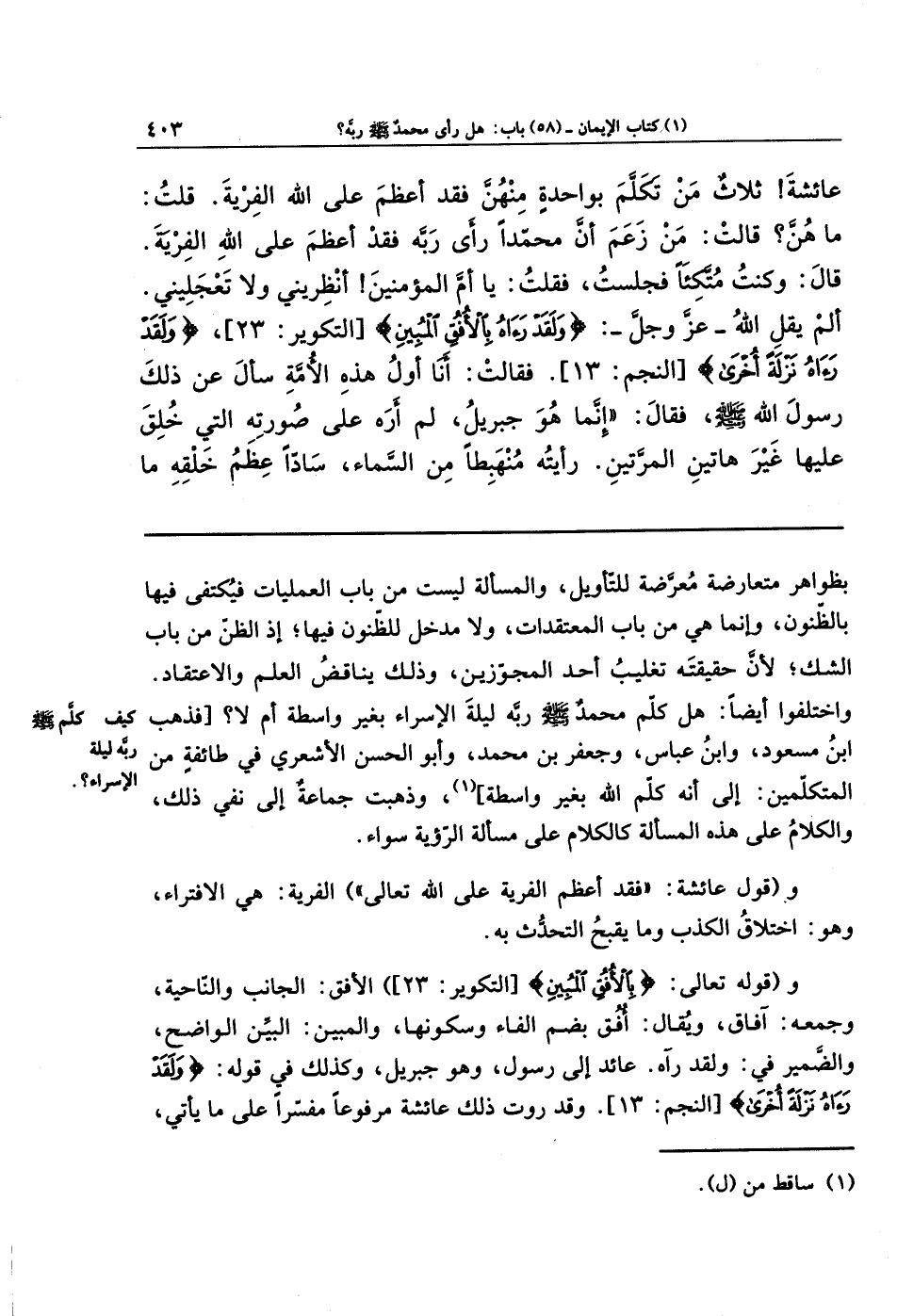 عَائِشَةَ! ثَلاثٌ مَن تَكَلَّمَ بِوَاحِدَةٍ مِنهُنَّ فَقَد أَعظَمَ عَلَى اللهِ الفِريَةَ. قُلتُ: مَا هُنَّ؟ قَالَت: مَن زَعَمَ أَنَّ مُحَمَّدًا رَأَى رَبَّهُ فَقَد أَعظَمَ عَلَى اللهِ الفِريَةَ. قَالَ: وَكُنتُ مُتَّكِئًا فَجَلَستُ، فَقُلتُ: يَا أُمَّ المُؤمِنِينَ! أَنظِرِينِي وَلا تَعجَلِيني. أَلَم يَقُلِ اللهُ عَزَّ وَجَلَّ: وَلَقَد رَآهُ بِالأُفُقِ المُبِينِ، وَلَقَد رَآهُ نَزلَةً أُخرَى. فَقَالَت: أَنَا أَوَّلُ هَذِهِ الأُمَّةِ سَأَلَ عَن ذَلِكَ رسولَ الله - صلى الله عليه وسلم - فقال: إِنَّمَا هو جِبرِيلُ، لَم أَرَهُ عَلَى صُورَتِهِ الَّتِي خُلِقَ عَلَيهَا غَيرَ هَاتَينِ المَرَّتَينِ، رَأَيتُهُ مُنهَبِطًا مِنَ السَّمَاءِ، سَادًّا عِظَمُ خَلقِهِ مَا
