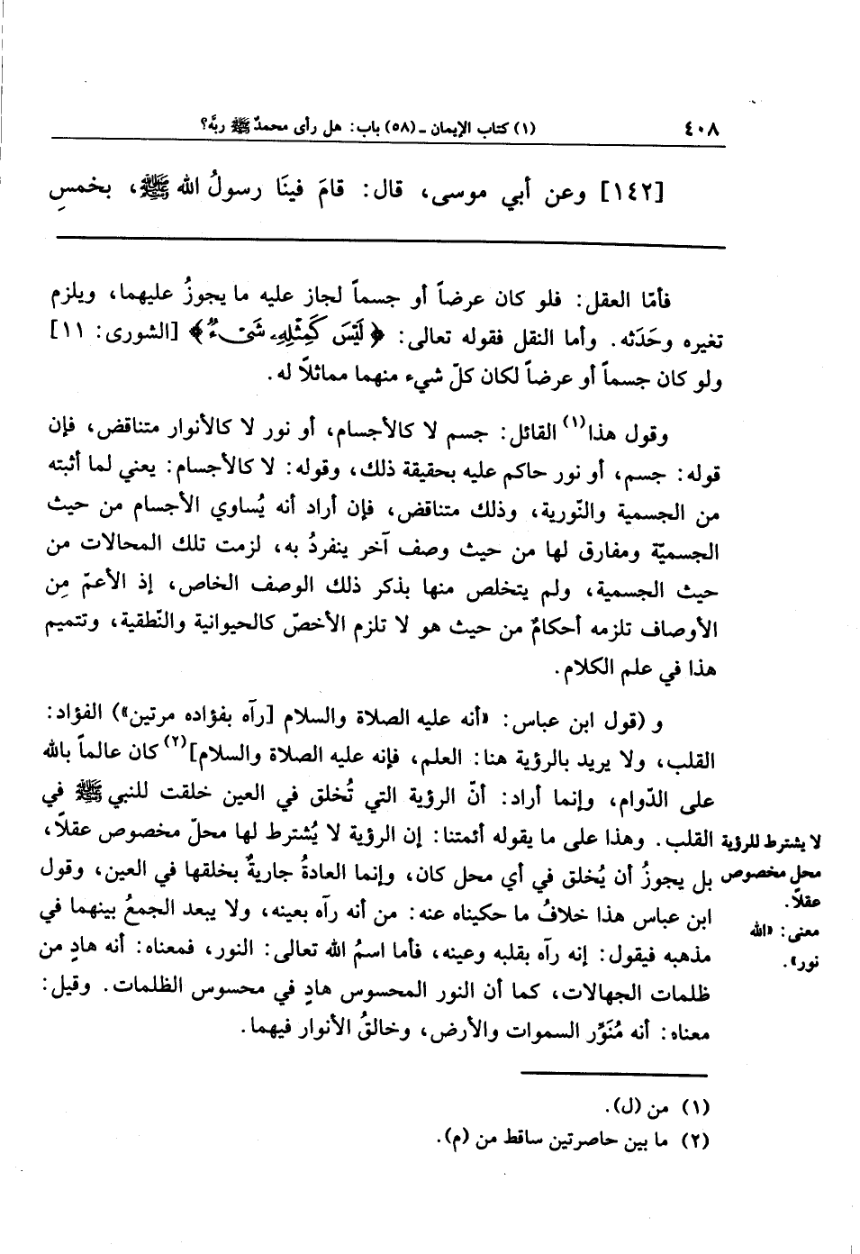 ولا يبعد الجمع بينهما في مذهبه، فيقول: إنه رآه بقلبه وعينه. فأما اسم الله تعالى: النور، فمعناه أنه هادٍ من ظلمات الجهالات، كما أن النور المحسوس هادٍ في محسوس الظلمات. وقيل: معناه أنه منوّر السماوات والأرض وخالق الأنوار فيهما.