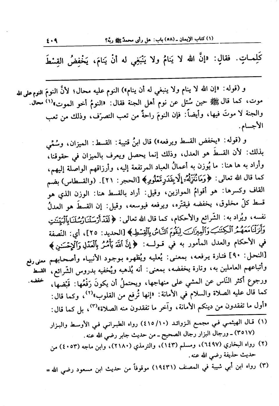 كَلِمَاتٍ، فَقَالَ: إِنَّ اللهَ لا يَنَامُ، وَلا يَنبَغِي لَهُ أَن يَنَامَ، يَخفِضُ القِسطَ