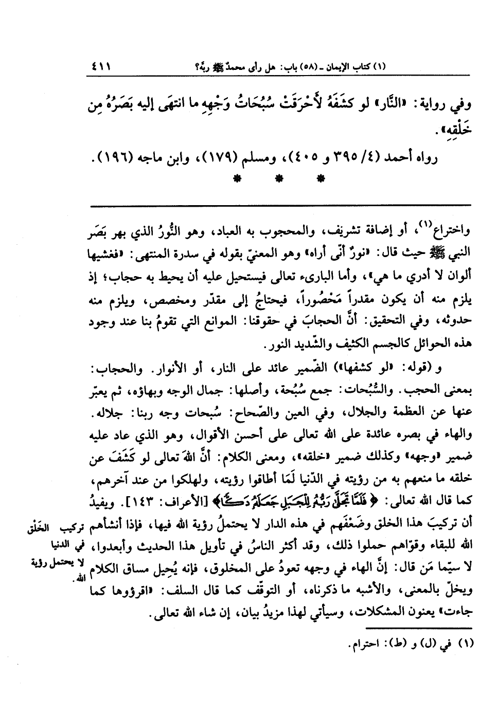 وَفِي رِوَايَةٍ: النَّارُ، لَو كَشَفَه لأَحرَقَت سُبُحَاتُ وَجهِهِ مَا انتَهَى إِلَيهِ بَصَرُهُ مِن خَلقِهِ.