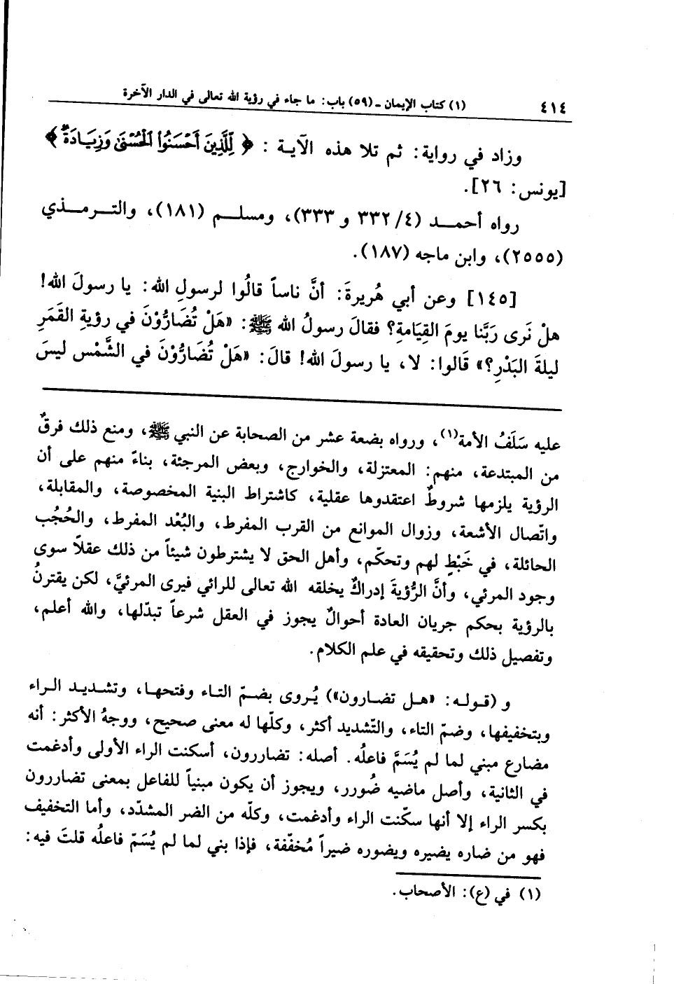 [145] وَعَن أَبِي هُرَيرَةَ؛ أَنَّ نَاسًا قَالُوا لِرَسُولِ اللهِ: يَا رَسُولَ اللهِ! هَل نَرَى رَبَّنَا يَومَ القِيَامَةِ؟ فَقَالَ رَسُولُ اللهِ - صلى الله عليه وسلم -: هَل تُضَارُّونَ فِي رؤية القَمَرِ لَيلَةَ البَدرِ؟ قَالُوا: لا، يَا رسولَ الله! قَالَ: هَل تُضَارُّونَ فِي الشَّمسِ لَيسَ