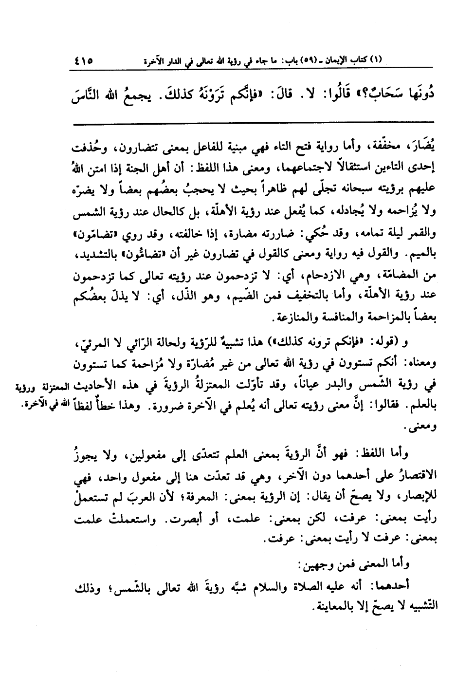 يُضَار مخفَّفة، وأمّا رواية فتح التاء، فهي مبنيّة للفاعل بمعنى تتضارون، وحُذِفت إحدى التاءين؛ استثقالا لاجتماعهما، ومعنى هذا اللفظ: أن أهل الجنة إذا امتنّ الله عليهم برؤيته سبحانه تجلّى لهم ظاهرًا، بحيث لا يحجب بعضهم بعضًا ولا يضره ولا يزاحمه ولا يجادله، كما يفعل عند رؤية الأهلّة، بل كالحال عند رؤية الشمس والقمر ليلة تمامه.