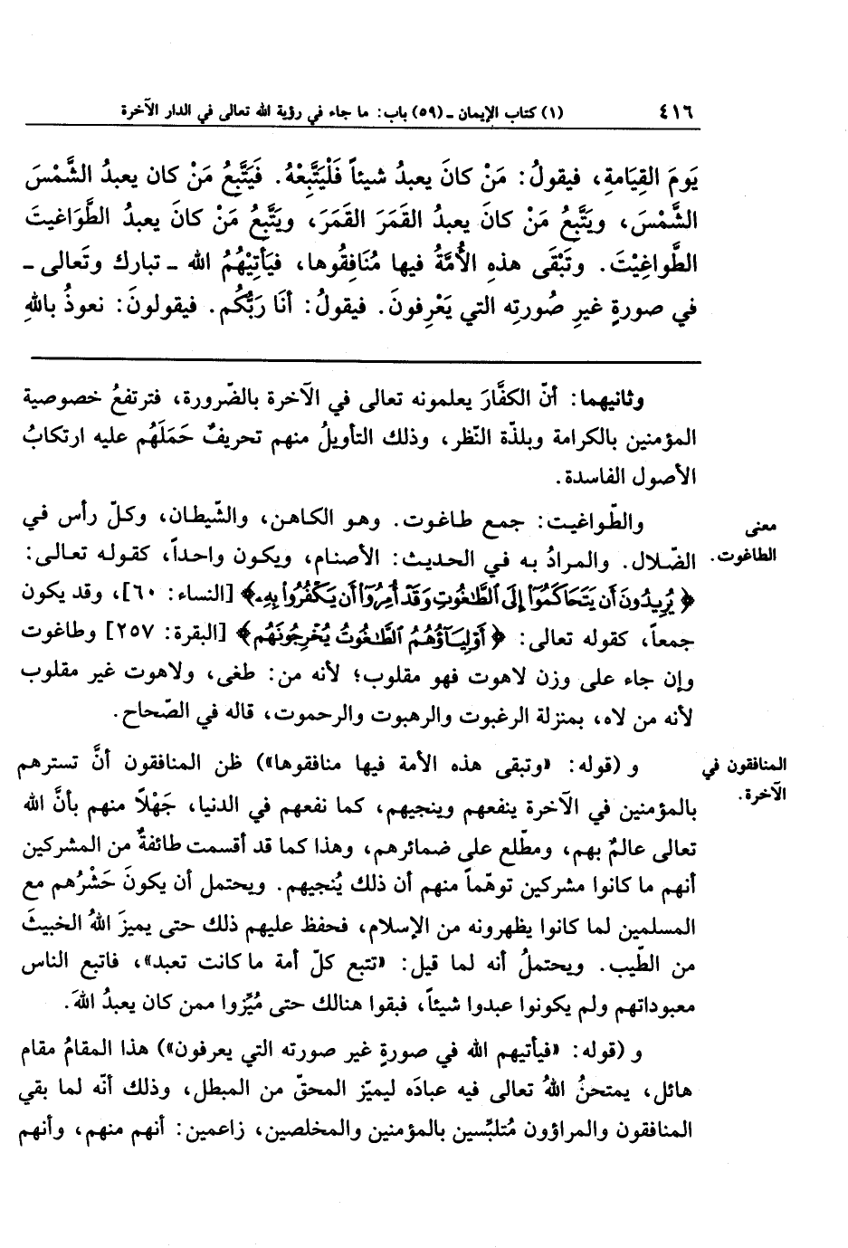يَومَ القِيَامَةِ، فَيَقُولُ: مَن كَانَ يَعبُدُ شَيئًا فَليَتَّبِعهُ، فَيَتَّبِعُ مَن كَانَ يَعبُدُ الشَّمسَ الشَّمسَ، وَيَتَّبِعُ مَن كَانَ يَعبُدُ القَمَرَ القَمَرَ، وَيَتَّبِعُ مَن كَانَ يَعبُدُ الطَّوَاغِيتَ الطَّوَاغِيتَ، وَتَبقَى هَذِهِ الأُمَّةُ فِيهَا مُنَافِقُوهَا، فَيَأتِيهِمُ اللهُ - تبارك وتعالى - فِي صُورَةٍ غَيرِ صُورَتِهِ الَّتِي يَعرِفُونَ، فَيَقُولُ: أَنَا رَبُّكُم، فَيَقُولُونَ: نَعُوذُ بِاللهِ