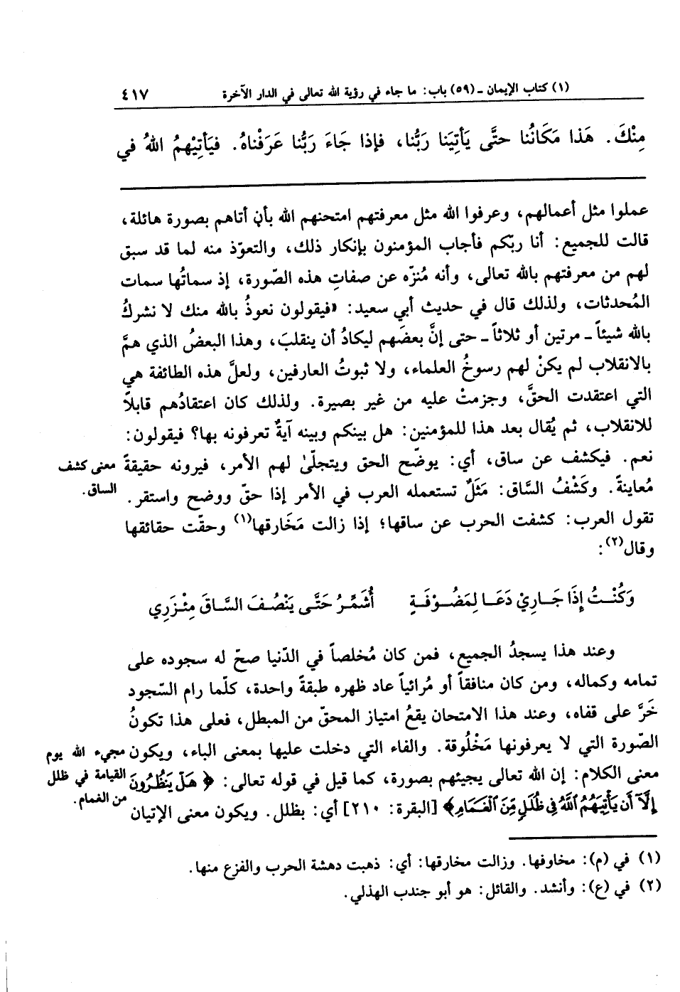 عملوا مثل أعمالهم وعرفوا اللهَ مثل معرفتهم، امتحنهم الله بأن أتاهم بصورة هائلة قالت للجميع: أنا ربُّكم، فأجاب المؤمنون بإنكار ذلك، والتعوُّذ منه؛ لما قد سبق لهم من معرفتهم بالله تعالى، وأنّه منزَّه عن صفات هذه الصورة؛ إذ سماتها سمات المُحدَثات، ولذلك قال في حديث أبي سعيد: فيقولون نعوذ بالله منك، لا نشرك بالله شيئًا مرّتين أو ثلاثًا، حتّى إنّ بعضهم ليكاد أن ينقلب. وهذا البعض الذي همّ بالانقلاب لم يكن لهم رسوخ العلماء ولا ثبوت العارفين، ولعلّ هذه الطائفة هي التي اعتقدت الحق، وجزمت عليه من غير بصيرة، ولذلك كان اعتقادهم قابلاً للانقلاب. ثم يقال بعد هذا للمؤمنين: هل بينكم وبينه آية تعرفونه بها؟ فيقولون: نعم، فيكشف عن ساقٍ؛ أي: يوضح الحقّ ويتجلّى لهم الأمر، فيرونه حقيقة معاينة.