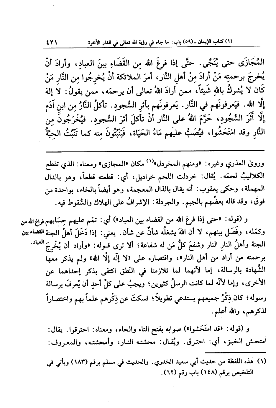 المُجَازَى حَتَّى يُنَجَّى، حَتَّى إِذَا فَرَغَ اللهُ مِنَ القَضَاءِ بَينَ العِبَادِ، وَأَرَادَ أَن يُخرِجَ بِرَحمَتِهِ مَن أَرَادَ مِن أهل النَّارِ، أَمَرَ المَلائِكَةَ أَن يُخرِجُوا مِنَ النَّارِ مَن كَانَ لا يُشرِكُ بِاللهِ شَيئًا مِمَّن أَرَادَ اللهُ تَعَالَى أَن يَرحَمَهُ، مِمَّن يَقُولُ: لا إِلهَ إِلا اللهُ، فَيَعرِفُونَهُم فِي النَّارِ، يَعرِفُونَهُم بِأَثَرِ السُّجُودِ؛ تَأكُلُ النَّارُ مِنِ ابنِ آدَمَ إِلا أَثَرَ السُّجُودِ، حَرَّمَ اللهُ عَلَى النَّارِ أَن تَأكُلَ أَثَرَ السُّجُودِ. فَيُخرَجُونَ مِنَ النَّارِ وقَدِ امتَحَشُوا، فَيُصَبُّ عَلَيهِم مَاءُ الحَيَاةِ، فَيَنبُتُونَ مِنهُ كَمَا تَنبُتُ الحِبَّةُ