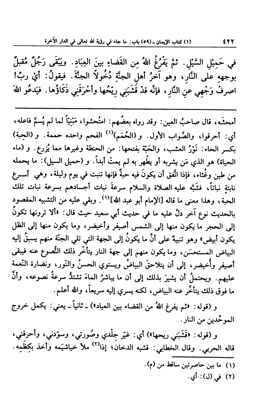 وماء الحياة هو الذي من يشربه أو يطهر به لم يمت أبدًا. وحميل السيل ما يحمله من طين وغثاء، فإذا اتفق أن يكون فيه حبة، فإنها تنبت في يوم وليلة، وهي أسرع نابتة نباتا، فشبّه - عليه الصلاة والسلام - سُرعة نبات أجسادهم بسرعة نبات تلك الحبة، وهذا معنى ما قاله الإمام أبو عبد الله (¬1). وبقي عليه من التشبيه المقصود بالحديث نوع آخر دلّ عليه ما في حديث أبي سعيد، حيث قال: ألا ترونها تكون إلى الحجر ما يكون منها إلى الشمس أصيفر وأخيضر، وما يكون منها إلى الظلّ يكون أبيض، وهو تنبيه على أن ما يكون إلى الجهة التي تلي الجنة منهم يسبق إليه البياض المستحسن. وما يكون منهم إلى جهة النار، يتأخر ذلك النصوع عنه، فيبقى أصيفر وأخيضر إلى أن يتلاحق البياض ويستوي الحُسن والنور ونضارة النعمة عليهم. ويحتمل أن يشير بذلك إلى أن ما يباشر الماء، تشتدّ سرعةُ نصوعه، وأنّ ما فوق ذلك يتأخر عنه البياض، لكنه يسري إليه سريعًا، والله أعلم.
