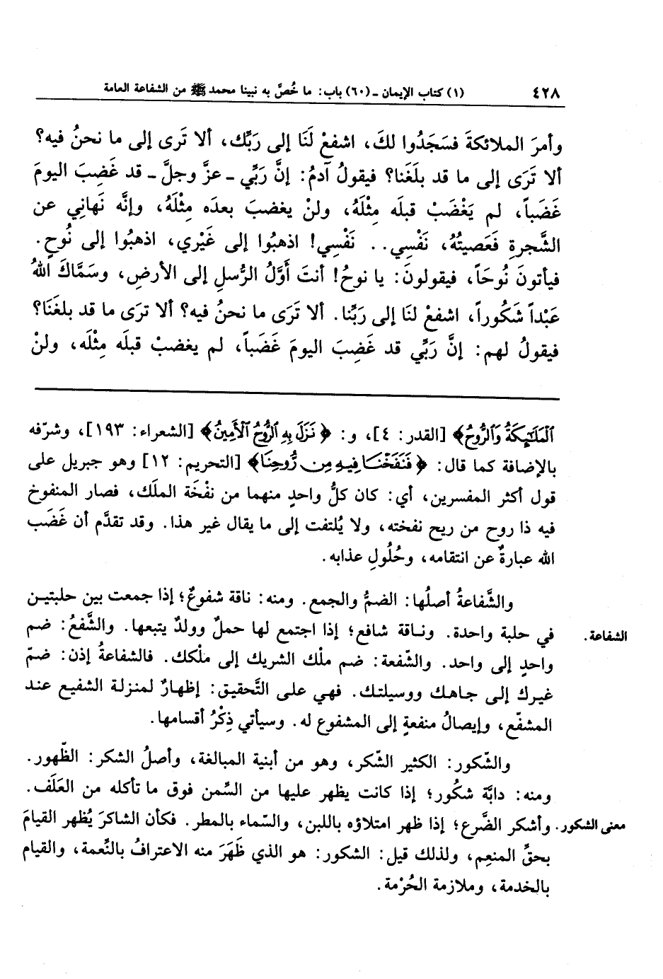 وَأَمَرَ المَلائِكَةَ فَسَجَدُوا لَكَ، اشفَع لَنَا إِلَى رَبِّكَ، أَلا تَرَى إِلَى مَا نَحنُ فِيهِ؟ أَلا تَرَى إِلَى مَا قَد بَلَغَنَا؟ فَيَقُولُ آدَمُ: إِنَّ رَبِّي - عَزَّ وَجَّلَّ - قَد غَضِبَ اليَومَ غَضَبًا لَم يَغضَب قَبلَهُ مِثلَهُ، وَلَن يَغضَبَ بَعدَهُ مِثلَهُ، وَإِنَّهُ نَهَانِي عَنِ الشَّجَرَةِ فَعَصَيتُهُ، نَفسِي، نَفسِي، اذهَبُوا إِلَى غَيرِي، اذهَبُوا إِلَى نُوحٍ. فَيَأتُونَ نُوحًا، فَيَقُولُونَ: يَا نُوحُ! أَنتَ أَوَّلُ الرُّسُلِ إِلَى الأَرضِ، وَسَمَّاكَ اللهُ عَبدًا شَكُورًا، اشفَع لَنَا إِلَى رَبِّنا، أَلا تَرَى مَا نَحنُ فِيهِ؟ أَلا تَرَى مَا قَد بَلَغَنَا؟ فَيَقُولُ لَهُم: إِنَّ رَبِّي قَد غَضِبَ اليَومَ غَضَبًا لَم يَغضَب قَبلَهُ مِثلَهُ، وَلَن