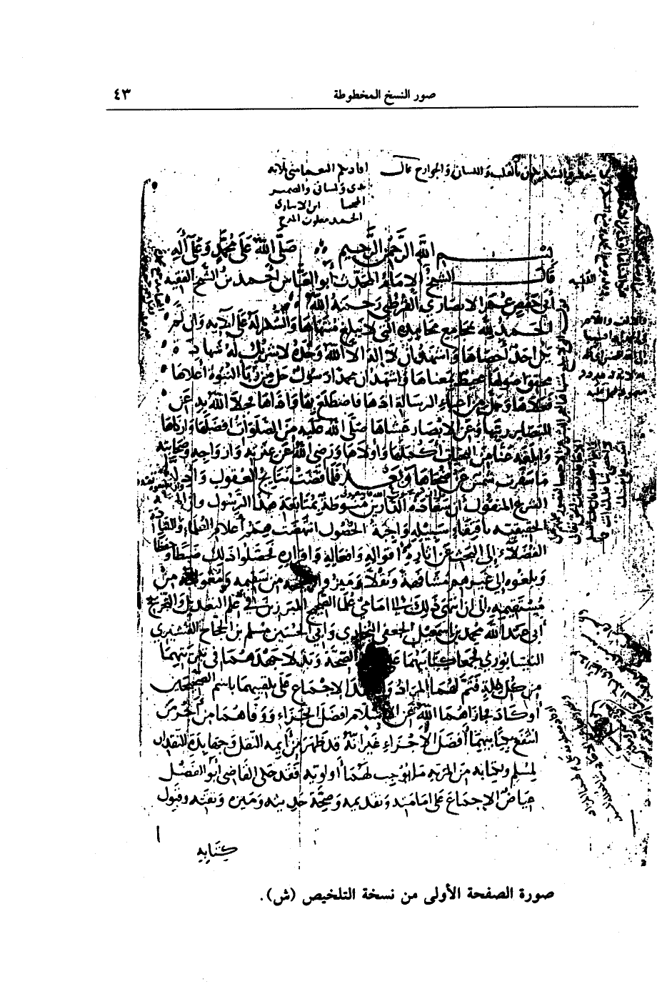 صورة الصفحة الأولى من نسخة التلخيص (ش).