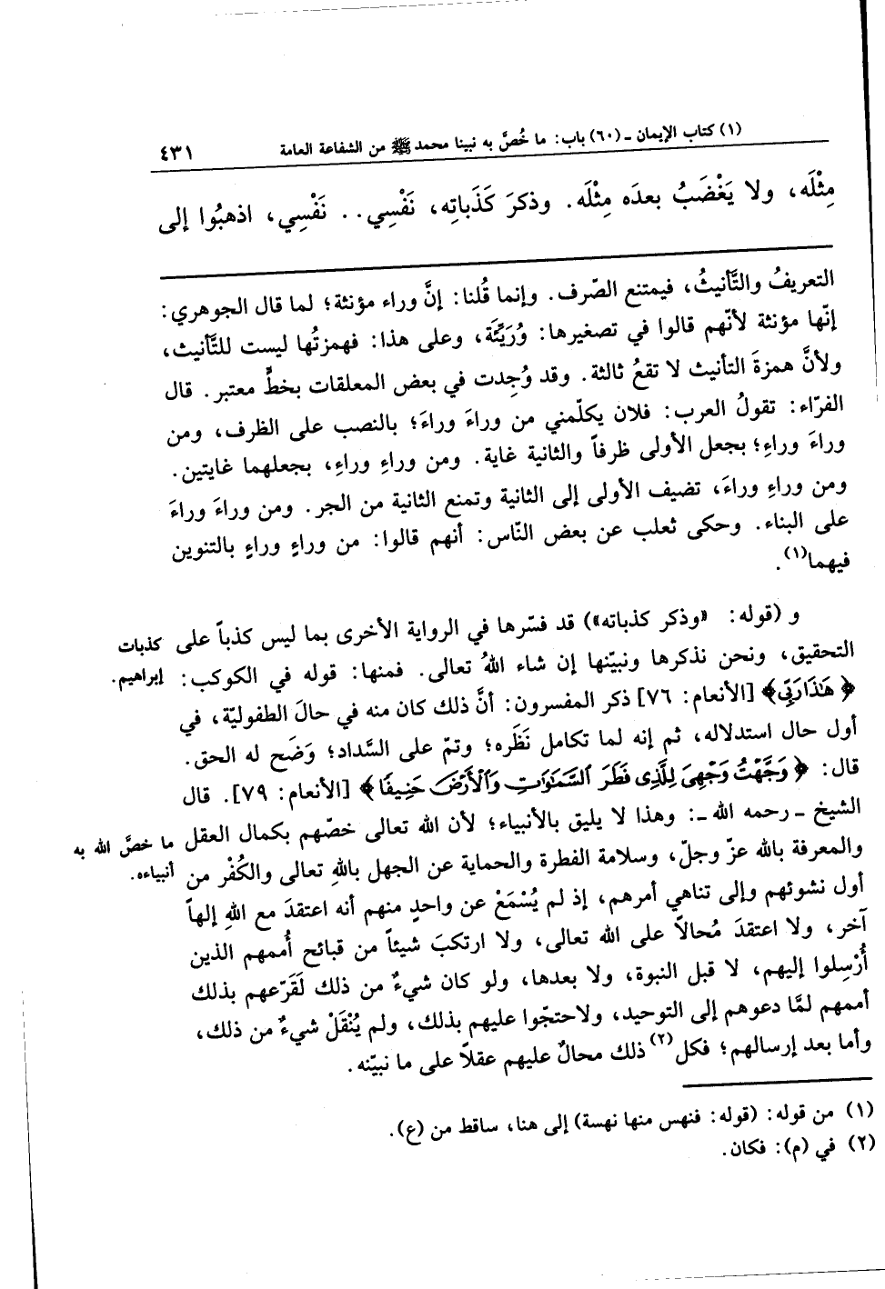 و(قوله: وذكر كذباته) قد فسّرها في الرواية الأخرى، بما ليس كذبًا على التحقيق، ونحن نذكرها ونبيّنها إن شاء الله تعالى. فمنها قوله في الكوكب: هَذَا رَبِّي ذكر المفسرون أنّ ذلك كان منه في حال الطفولية في أول حال استدلاله، ثم إنه لَمّا تكامل نظره؛ وتمّ على السداد وضح له الحق، قال: وَجَّهتُ وَجهِيَ لِلَّذِي فَطَرَ السَّمَاوَاتِ وَالأَرضَ حَنِيفًا.