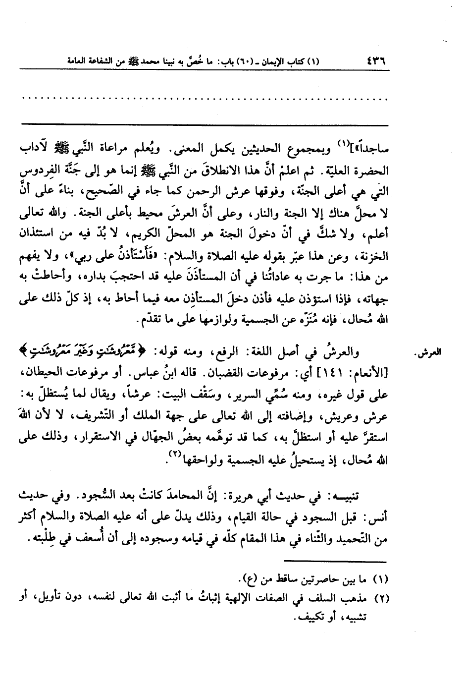 ساجدًا (¬1). وبمجموع الحديثين يكمل المعنى، ويعلم مراعاة النبي - صلى الله عليه وسلم - لآداب الحضرة العليّة. ثم اعلم أن هذا الانطلاق من النبي - صلى الله عليه وسلم - إنما هو إلى جنة الفردوس التي هي أعلى الجنة، وفوقها عرش الرحمن كما جاء في الصحيح؛ بناء على أن لا محل هناك إلا الجنة والنار، وعلى أنّ العرش محيط بأعلى الجنة، والله تعالى أعلم.