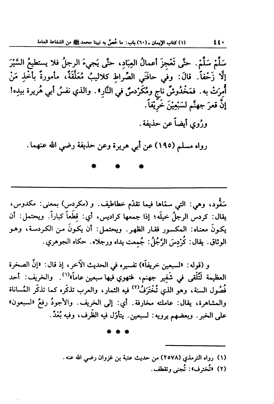 سَلِّم سَلِّم. حَتَّى تَعجِزَ أَعمَالُ العِبَادِ، حَتَّى يَجِيءَ الرَّجُلُ فَلا يَستَطِيعُ السَّيرَ إِلا زَحفًا. قَالَ: وَفِي حَافَتَيِ الصِّرَاطِ كَلالِيبُ مُعَلَّقَةٌ، مَأمُورَةٌ بِأَخذِ مَن أُمِرَت بِهِ. فَمَخدُوشٌ نَاجٍ وَمَكردسٌ فِي النَّارِ. وَالَّذِي نَفسُ أَبِي هُرَيرَةَ بِيَدِهِ! إِنَّ قَعرَ جَهَنَّمَ لَسَبعينَ خَرِيفًا.