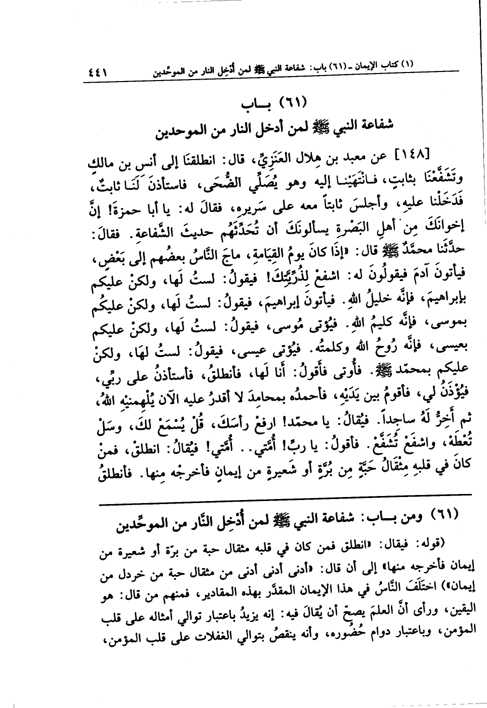 [148] عَن مَعبَدِ بنِ هِلالٍ العَنَزِيُّ؛ قَالَ: انطَلَقنَا إِلَى أَنَسِ بنِ مَالِكٍ وَتَشَفَّعنَا بِثَابِتٍ. فَانتَهَينَا إِلَيهِ وهو يُصَلِّي الضُّحَى. فَاستَأذَنَ لَنَا ثَابِتٌ. فَدَخَلنَا عَلَيهِ، وَأَجلَسَ ثَابِتًا مَعَهُ عَلَى سَرِيرِهِ. فَقَالَ لَهُ: يَا أَبَا حَمزَةَ! إِنَّ إِخوَانَكَ مِن أهل البَصرَةِ يَسأَلُونَكَ أَن تُحَدِّثَهُم حَدِيثَ الشَّفَاعَةِ. فَقَالَ: حَدَّثَنَا مُحَمَّدٌ - صلى الله عليه وسلم - قَالَ: إِذَا كَانَ يَومُ القِيَامَةِ، مَاجَ النَّاسُ بَعضُهُم إِلَى بَعضٍ، فَيَأتُونَ آدَمَ فَيَقُولُونَ لَهُ: اشفَع لِذُرِّيَّتِكَ. فَيَقُولُ: لَستُ لَهَا، وَلَكِن عَلَيكُم بِإِبرَاهِيمَ، فَإِنَّهُ خَلِيلُ اللهِ. فَيَأتُونَ إِبرَاهِيمَ، فَيَقُولُ: لَستُ لَهَا، وَلَكِن عَلَيكُم بِمُوسَى، فَإِنَّهُ كَلِيمُ اللهِ. فَيُؤتَى مُوسَى، فَيَقُولُ: لَستُ لَهَا، وَلَكِن عَلَيكُم بِعِيسَى، فَإِنَّهُ رُوحُ اللهِ وَكَلِمَتُهُ، فَيُؤتَى عِيسَى، فَيَقُولُ: لَستُ لَهَا، وَلَكِن عَلَيكُم بِمُحَمَّدٍ - صلى الله عليه وسلم - فَأُوتَى فَأَقُولُ: أَنَا لَهَا. فأَنطَلِقُ فَأَستَأذِنُ عَلَى رَبِّي، فَيُؤذَنُ لِي، فَأَقُومُ بَينَ يَدَيهِ، فَأَحمَدُهُ بِمَحَامِدَ لا أَقدِرُ عَلَيهِ الآنَ يُلهِمُنِيهِ اللهُ، ثُمَّ أَخِرُّ له سَاجِدًا. فَيُقَالُ: يَا مُحَمَّدُ! ارفَع رَأسَكَ، قُل يُسمَع لَكَ، وَسَل تُعطَه، وَاشفَع تُشَفَّع. فَأَقُولُ: يَا رَبِّ! أُمَّتِي. أُمَّتِي، فَيُقَالُ: انطَلِق فَمَن كَانَ فِي قَلبِهِ مِثقَالُ حَبَّةٍ مِن بُرَّةٍ أو شَعِيرَةٍ مِن إِيمَانٍ فَأَخرِجهُ مِنهَا. فَأَنطَلِقُ