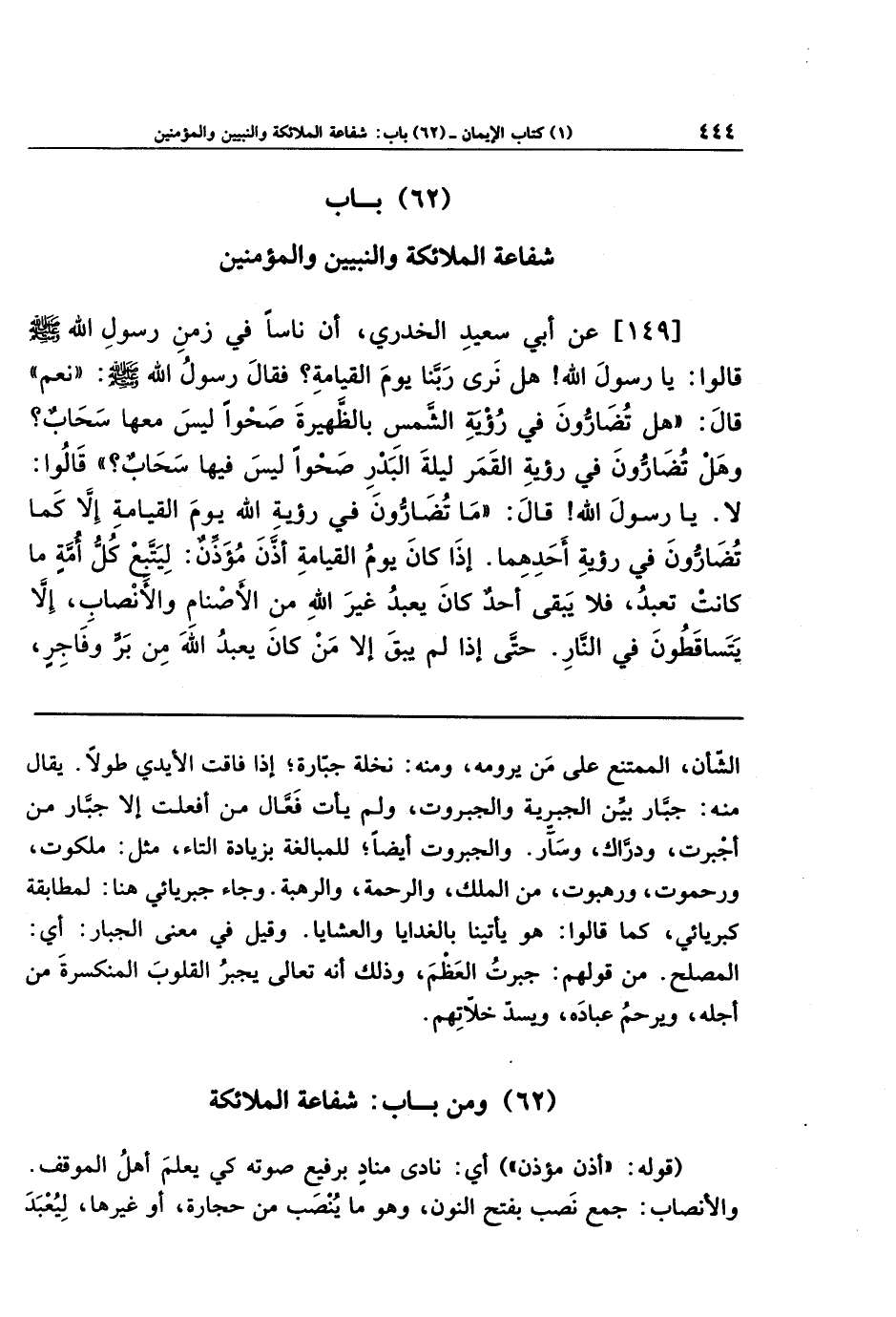 [149] عَن أَبِي سَعِيدٍ الخُدرِيِّ؛ أَنَّ نَاسًا فِي زَمَنِ رَسُولِ اللهِ - صلى الله عليه وسلم - قَالُوا: يَا رسولَ الله! هَل نَرَى رَبَّنَا يَومَ القِيَامَةِ؟ فَقَالَ رَسُولُ اللهِ - صلى الله عليه وسلم -: نَعَم قَالَ: هَل تُضَارُّونَ فِي رُؤيَةِ الشَّمسِ بِالظَّهِيرَةِ صَحوًا لَيسَ مَعَهَا سَحَابٌ؟ وَهَل تُضَارُّونَ فِي رُؤيَةِ القَمَرِ لَيلَةَ البَدرِ صَحوًا لَيسَ فِيهَا سَحَابٌ؟ قَالُوا: لا. يَا رسولَ الله! قَالَ: مَا تُضَارُّونَ فِي رُؤيَةِ اللهِ يَومَ القِيَامَةِ إِلا كَمَا تُضَارُّونَ فِي رُؤيَةِ أَحَدِهِمَا. إِذَا كَانَ يَومُ القِيَامَةِ أَذَّنَ مُؤَذِّنٌ: لِيَتَّبِع كُلُّ أُمَّةٍ مَا كَانَت تَعبُدُ. فَلا يَبقَى أَحَدٌ كَانَ يَعبُدُ غَيرَ اللهِ مِنَ الأَصنَامِ وَالأَنصَابِ، إِلا يَتَسَاقَطُونَ فِي النَّارِ. حَتَّى إِذَا لَم يَبقَ إِلا مَن كَانَ يَعبُدُ اللهَ مِن بَرٍّ وَفَاجِرٍ،