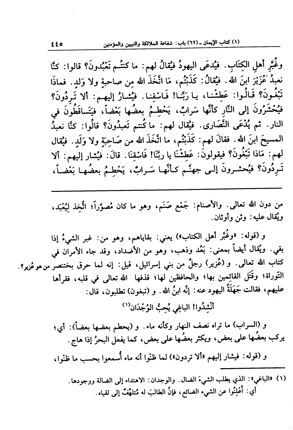 وَغُبَّرِ أهل الكِتَابِ. فُيدعَى اليَهُودُ فَيُقَالُ لَهُم: مَا كُنتُم تَعبُدُونَ؟ قَالُوا: كُنَّا نَعبُدُ عُزَيرَ ابنَ اللهِ. فَيُقَالُ: كَذَبتُم، مَا اتَّخَذَ اللهُ مِن صَاحِبَةٍ وَلا وَلَدٍ. فَمَاذَا تَبغُونَ؟ قَالُوا: عَطِشنَا، يَا رَبَّنَا! فَاسقِنَا. فَيُشَارُ إِلَيهِم: أَلا تَرِدُونَ؟ فَيُحشَرُونَ إِلَى النَّارِ كَأَنَّهَا سَرَابٌ، يَحطِمُ بَعضُهَا بَعضًا، فَيَتَسَاقَطُونَ فِي النَّارِ. ثُمَّ يُدعَى النَّصَارَى. فَيُقَالُ لَهُم: مَا كُنتُم تَعبُدُونَ؟ قَالُوا: كُنَّا نَعبُدُ المَسِيحَ ابنَ اللهِ. فَيُقَالُ لَهُم: كَذَبتُم، مَا اتَّخَذَ اللهُ مِن صَاحِبَةٍ وَلا وَلَدٍ، فَيُقَالُ لَهُم: مَاذَا تَبغُونَ؟ فَيَقُولُونَ: عَطِشنَا، يَا رَبَّنَا! فَاسقِنَا. قَالَ: فَيُشَارُ إِلَيهِم: أَلا ترِدُونَ؟ فَيُحشَرُونَ إِلَى جَهَنَّمَ كَأَنَّهَا سَرَابٌ، يَحطِمُ بَعضُهَا بَعضًا،