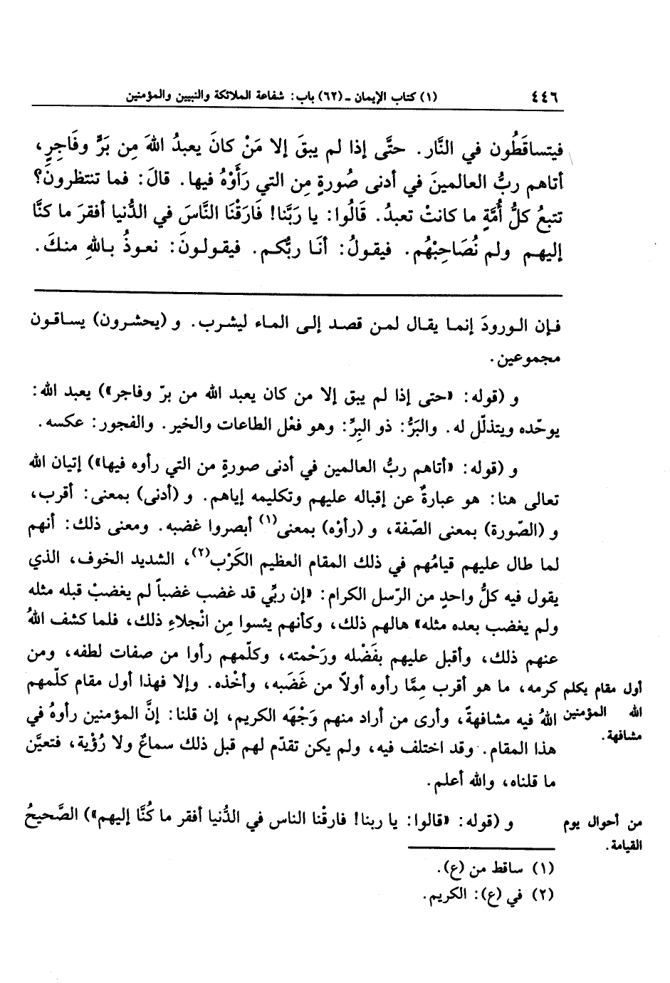 فَيَتَسَاقَطُونَ فِي النَّارِ. حَتَّى إِذَا لَم يَبقَ إِلا مَن كَانَ يَعبُدُ اللهَ مِن بَرٍّ وَفَاجِرٍ، أَتَاهُم رَبُّ العَالَمِينَ فِي أَدنَى صُورَةٍ مِنِ الَّتِي رَأَوهُ فِيهَا. قَالَ: فَمَا تَنتَظِرُونَ؟ تَتبَعُ كُلُّ أُمَّةٍ مَا كَانَت تَعبُدُ. قَالُوا: يَا رَبَّنَا! فَارَقنَا النَّاسَ فِي الدُّنيَا أَفقَرَ مَا كُنَّا إِلَيهِم وَلَم نُصَاحِبهُم، فَيَقُولُ: أَنَا رَبُّكُم. فَيَقُولُونَ: نَعُوذُ بِاللهِ مِنكَ.