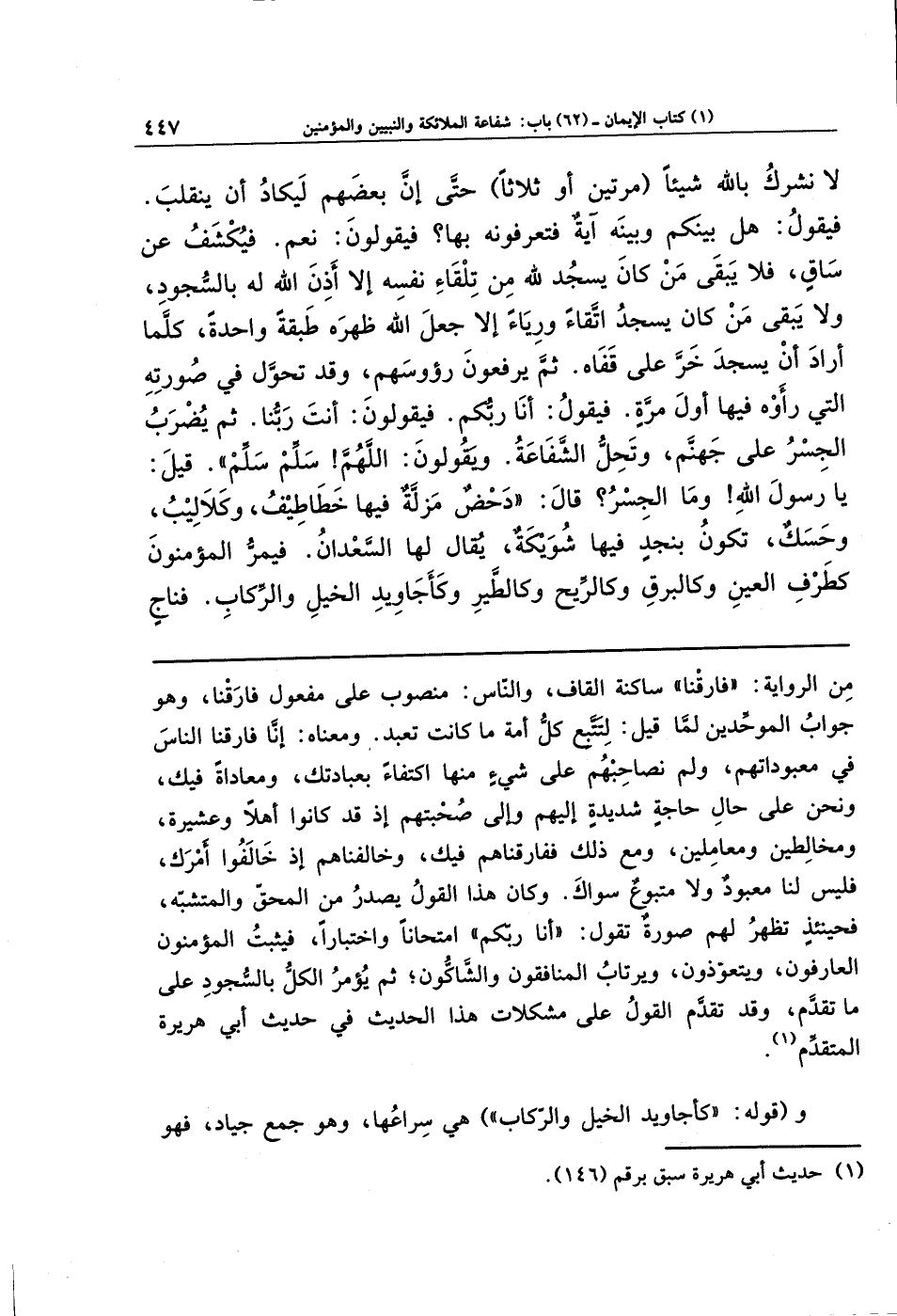 لا نُشرِكُ بِاللهِ شَيئًا - مَرَّتَينِ أو ثَلاثًا - حَتَّى إِنَّ بَعضَهُم لَيَكَادُ أَن يَنقَلِبَ. فَيَقُولُ: هَل بَينَكُم وَبَينَهُ آيَةٌ فَتَعرِفُونَهُ بِهَا؟ فَيَقُولُونَ: نَعَم. فَيُكشَفُ عَن سَاقٍ، فَلا يَبقَى مَن كَانَ يَسجُدُ لِلَّهِ مِن تِلقَاءِ نَفسِهِ إِلا أَذِنَ اللهُ لَهُ بِالسُّجُودِ، وَلا يَبقَى مَن كَانَ يَسجُدُ اتِّقَاءً وَرِيَاءً إِلا جَعَلَ اللهُ ظَهرَهُ طَبَقَةً وَاحِدَةً، كُلَّمَا أَرَادَ أَن يَسجُدَ خَرَّ عَلَى قَفَاهُ. ثُمَّ يَرفَعُونَ رُءُوسَهُم، وَقَد تَحَوَّلَ فِي صُورَته الَّتِي رَأَوهُ فِيهَا أَوَّلَ مَرَّةٍ. فَيقَول: أَنَا رَبُّكُم. فَيَقُولُونَ: أَنتَ رَبُّنَا. ثُمَّ يُضرَبُ الجِسرُ عَلَى جَهَنَّمَ، وَتَحِلُّ الشَّفَاعَةُ. وَيَقُولُونَ: اللهُمَّ! سَلِّم. سَلِّم. قِيلَ: يَا رسولَ الله! وَمَا الجِسرُ؟ قَالَ: دَحضٌ مَزِلَّةٌ. فِيها خَطَاطِيفُ وَكَلالِيبُ، وَحَسَكٌ، تَكُونُ بِنَجدٍ فِيهَا شُوَيكَةٌ، يُقَالُ لَهَا السَّعدَانُ. فَيَمُرُّ المُؤمِنُونَ كَطَرفِ العَينِ وَكَالبَرقِ وَكَالرِّيحِ وَكَالطَّيرِ وَكَأَجَاوِيدِ الخَيلِ وَالرِّكَابِ. فَنَاجٍ