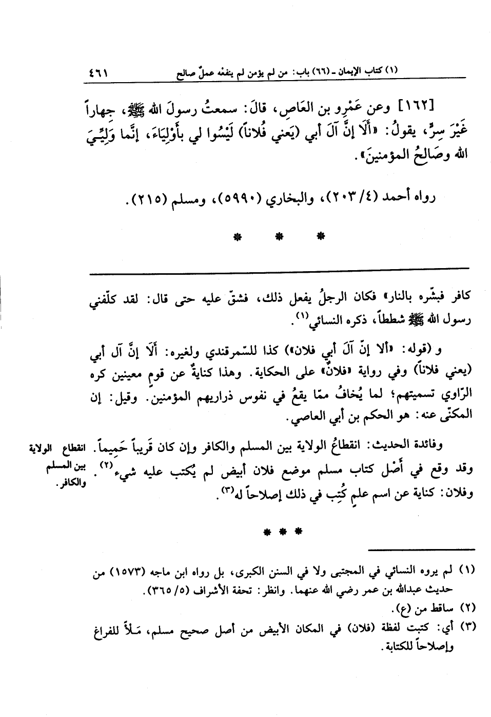 [162] وَعَن عمرو بنِ العَاصِ، قَالَ: سَمِعتُ رسولَ الله - صلى الله عليه وسلم -، جِهَارًا غَيرَ سِرٍّ، يَقُولُ: أَلا إِنَّ آلَ أَبِي - يَعنِي فُلانًا - لَيسُوا لِي بِأَولِيَاءَ. إِنَّمَا وَلِيِّيَ اللهُ وَصَالِح المُؤمِنِينَ.