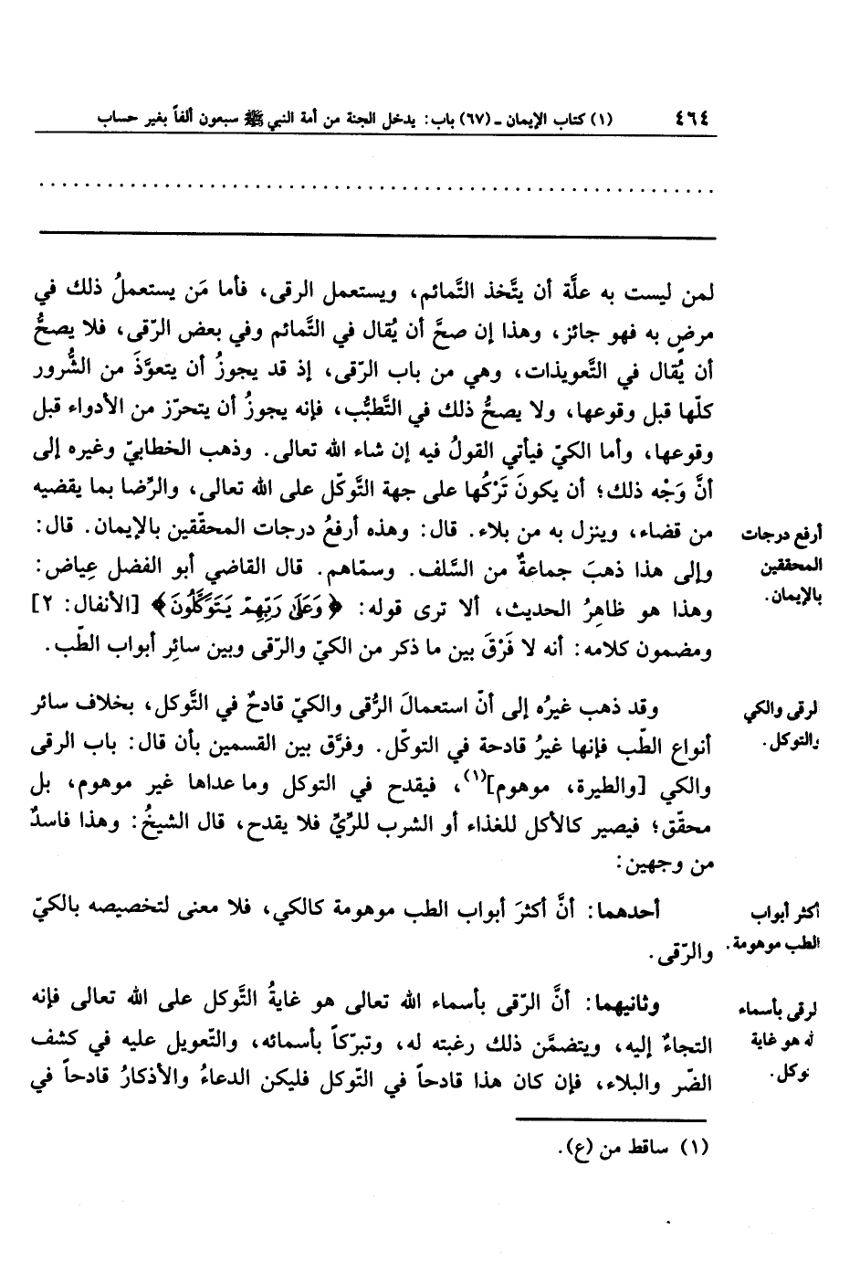 وقد ذهب غيره إلى أنّ استعمال الرقى والكيّ قادح في التوكّل بخلاف سائر أنواع الطبّ، فإنّها غير قادحة في التوكّل، وفرّق بين القسمين بأن قال: باب الرقى والكيّ والطِيَرة موهوم (¬1) فيقدح في التوكل، وما عداها غير موهوم بل محقّق، فيصير كالأكل للغذاء أو الشرب للريّ، فلا يقدح. قال الشيخ: وهذا فاسد من وجهين: