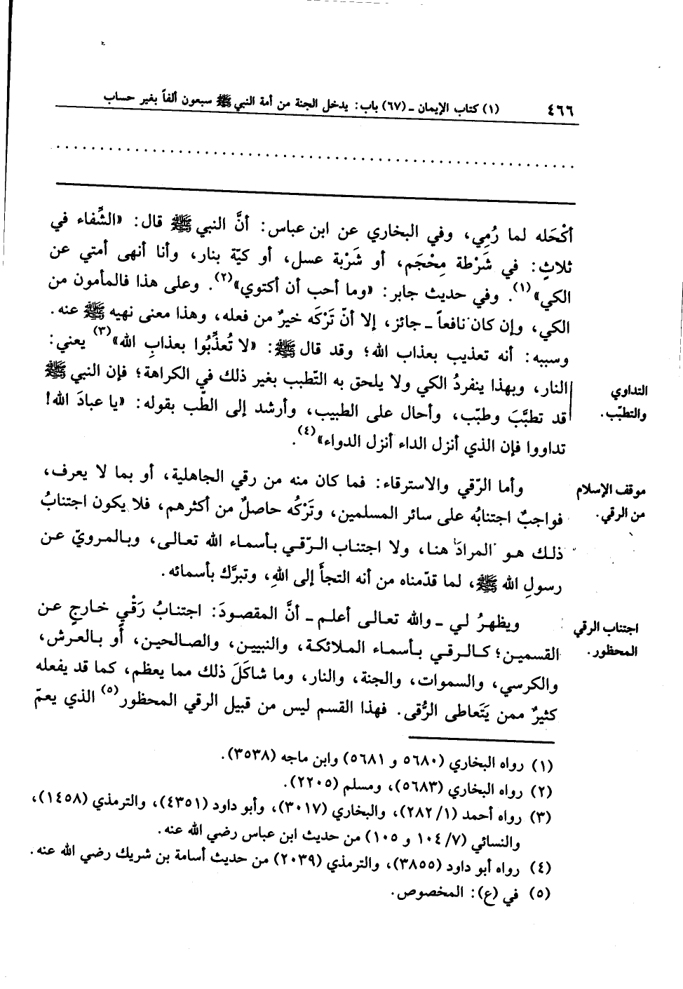 ويظهر لي - والله تعالى أعلم - أنّ المقصود: اجتناب رقي خارج عن القسمين، كالرقي بأسماء الملائكة والنبيّين والصالحين، أو بالعرش والكرسيّ والسماوات والجنّة والنار وما شاكل ذلك ممّا يعظَّم، كما قد يفعله كثير ممن يتعاطى الرقى، فهذا القسم ليس من قبيل الرقي المحظور (¬5) الذي يعمّ
