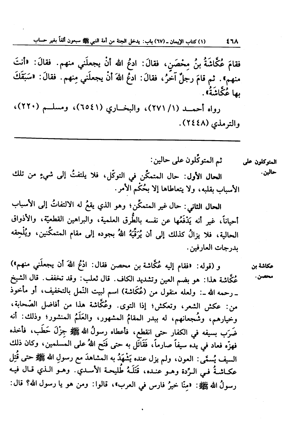 فَقَامَ عُكَّاشَةُ بنُ مِحصَنٍ، فَقَالَ: ادعُ اللهَ أَن يَجعَلَنِي مِنهُم. فَقَالَ: أَنتَ مِنهُم. ثُمَّ قَامَ رَجُلٌ آخَرُ، فَقَالَ: ادعُ اللهَ أَن يَجعَلَنِي مِنهُم. فَقَالَ: سَبَقَكَ بِهَا عُكَّاشَةُ.