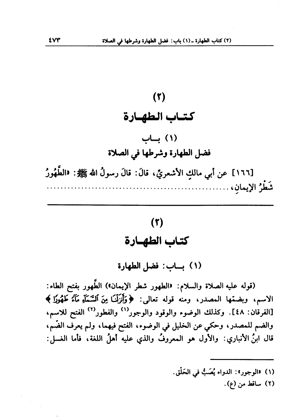 [166] عَن أَبِي مَالِكٍ الأَشعَرِيِّ؛ قَالَ: قَالَ رَسُولُ اللهِ - صلى الله عليه وسلم -: الطُّهُورُ شَطرُ الإِيمَانِ،