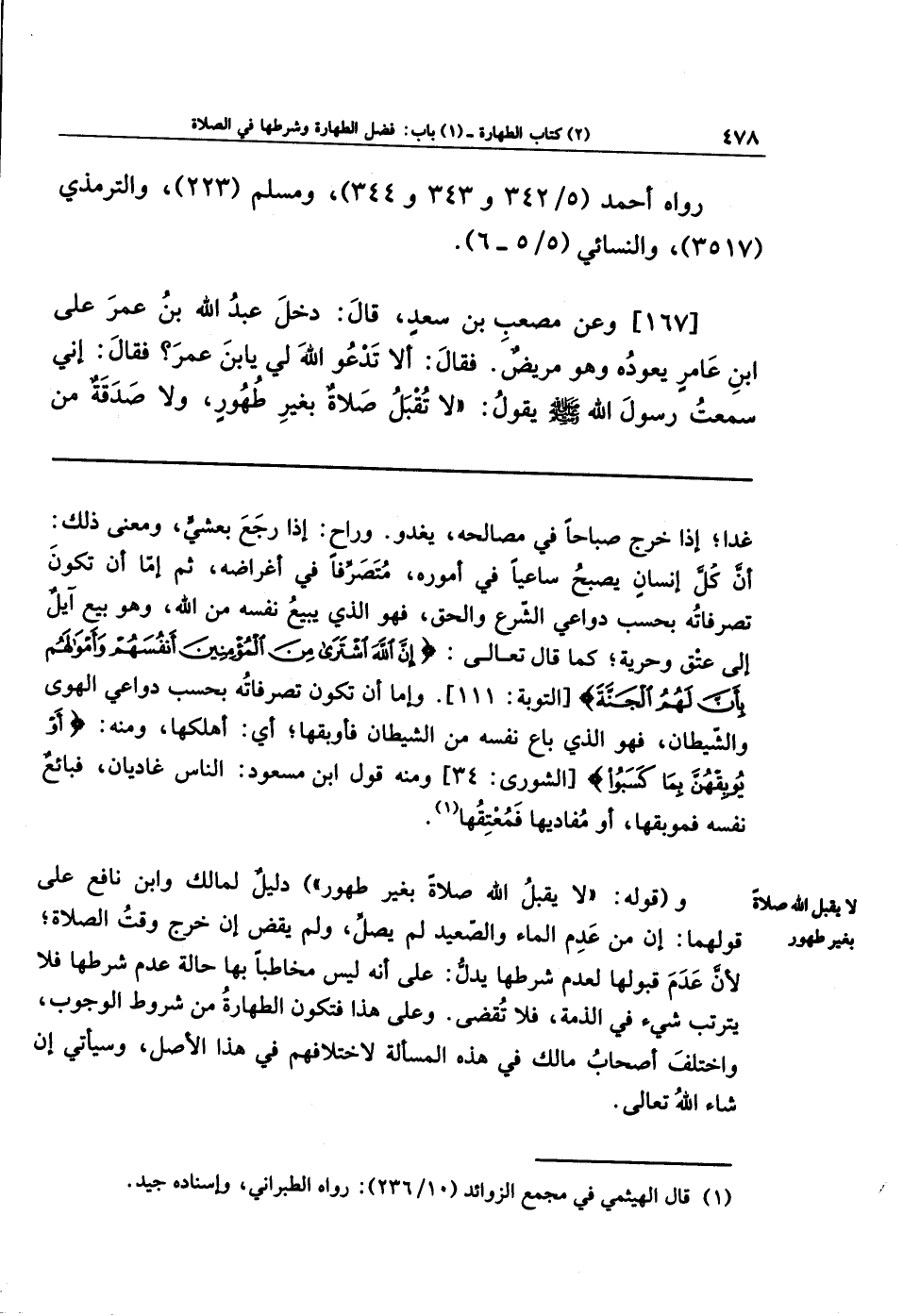 [167] وَعَن مُصعَبِ بنِ سَعدٍ؛ قَالَ: دَخَلَ عَبدُ اللهِ بنُ عُمَرَ عَلَى ابنِ عَامِرٍ يَعُودُهُ وهو مَرِيضٌ، فَقَالَ: أَلا تَدعُو اللهَ لِي يَا ابنَ عُمَرَ؟ فَقَالَ: إِنِّي سَمِعتُ رسولَ الله - صلى الله عليه وسلم - يَقُولُ: لا تُقبَلُ صَلاةٌ بِغَيرِ طُهُورٍ، وَلا صَدَقَةٌ مِن