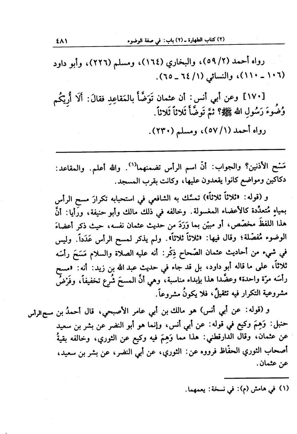 [170] وَعَن أَبِي أَنَسٍ؛ أَنَّ عُثمَانَ تَوَضَّأَ بِالمَقَاعِدِ فَقَالَ: أَلا أُرِيكُم وُضُوءَ رَسُولِ اللهِ - صلى الله عليه وسلم -؟ ثُمَّ تَوَضَّأَ ثَلاثًا ثَلاثًا.