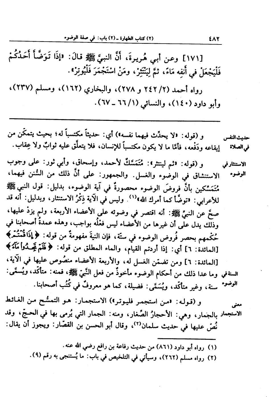 [171] وَعَن أَبِي هُرَيرَةَ؛ أَنَّ النَبي - صلى الله عليه وسلم - قَالَ: إِذَا تَوَضَّأَ أَحَدُكُم فَلِيَجعَل فِي أَنفِهِ مَاءً، ثُمَّ لِيَنتَثِر، وَمَنِ استَجمَرَ فَليُوتِر.