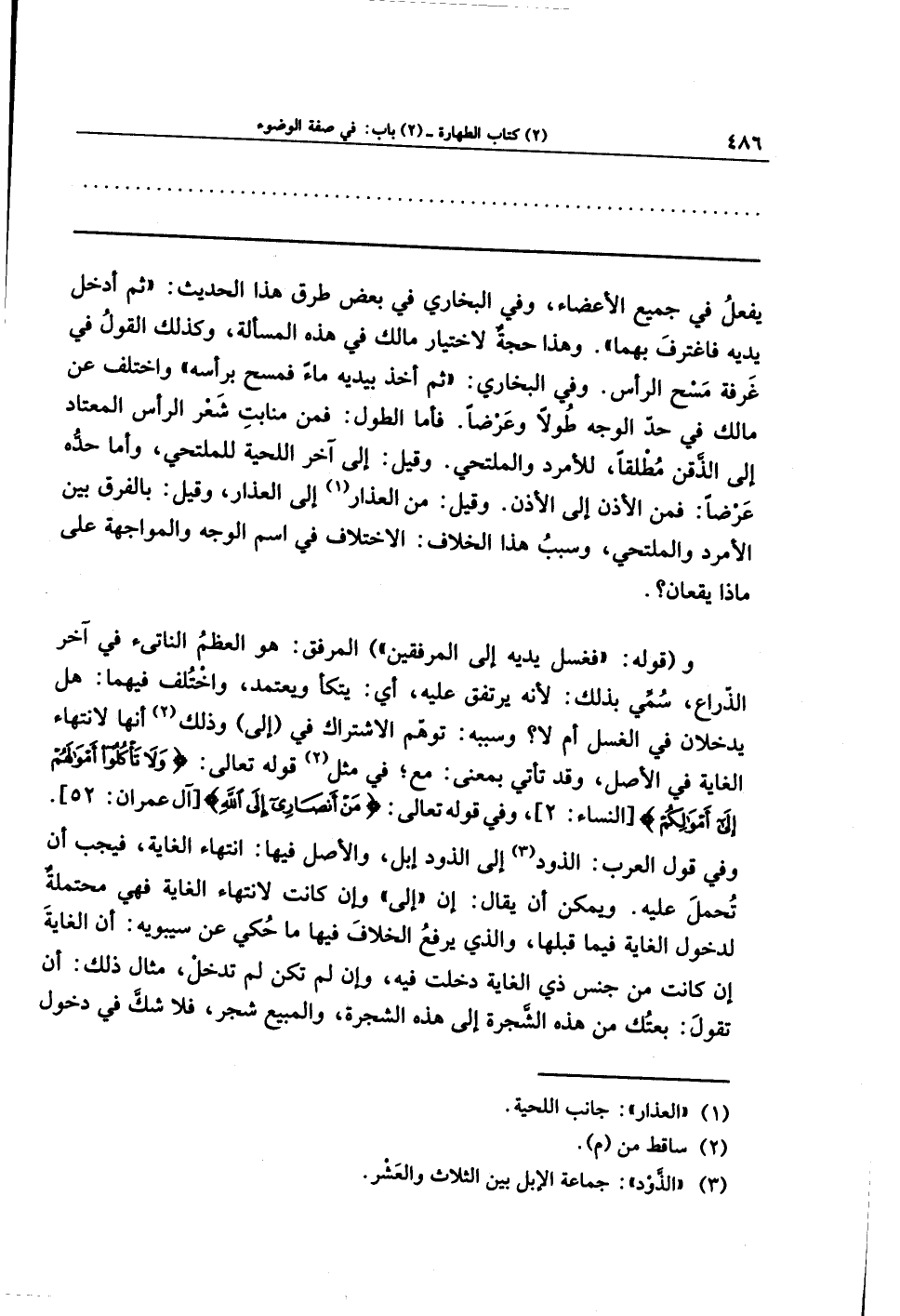وفي البخاري: ثم أخذ بيديه ماء فمسح برأسه. واختلف عن مالك في حدِّ الوجه طولاً وعرضًا. فأما الطول فمن منابت شعر الرأس المعتاد إلى الذقن مُطلقًا، للأمردِ والملتحي. وقيل: إلى آخر اللحية للملتحي. وأما حدُّه عرضًا؛ فمن الأذن إلى الأذن. وقيل: من العذار (¬1) إلى العذار، وقيل: بالفرق بين الأمرد والملتحي، وسبب هذا الخلاف: الاختلاف في اسم الوجه والمواجهة على ماذا يقعان؟