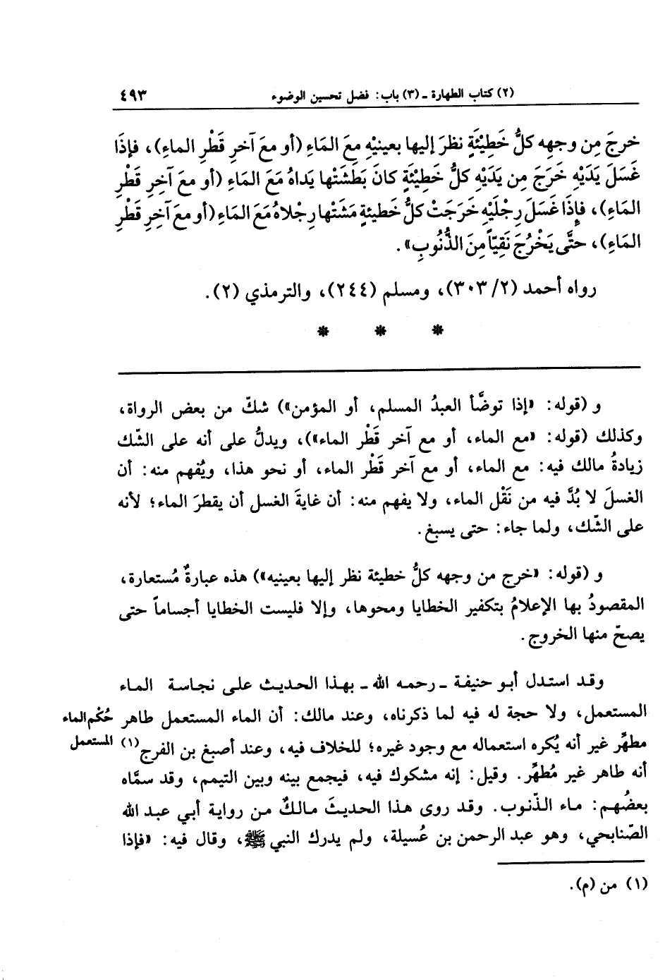 وقد استدل أبو حنيفة رحمه الله بهذا الحديث على نجاسة الماء المستعمل، ولا حجة له فيه لما ذكرناه، وعند مالك: أن الماء المستعمل طاهرٌ مطهرٌ؛ غير أنه يكره استعماله مع وجود غيره؛ للخلاف فيه، وعند أصبغ بن الفرج (¬1): أنه طاهرٌ غير مُطهرٍ. وقيل: إنه مشكوك فيه، فيجمع بينه وبين التيمم، وقد سماه بعضهم: ماء الذنوب.