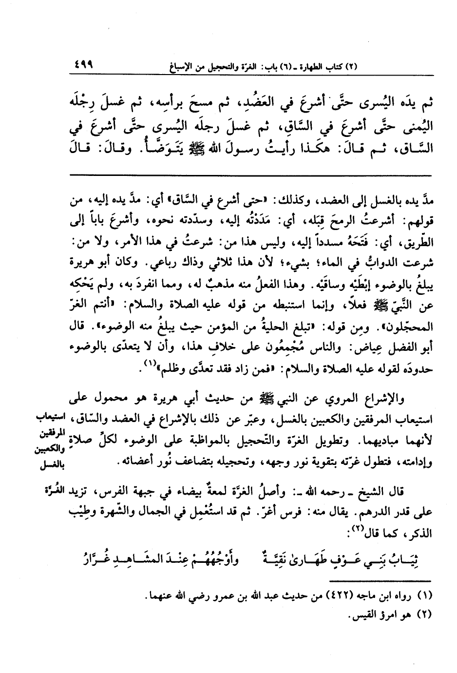والإشراعُ المروي عن النبي - صلى الله عليه وسلم - من حديث أبي هريرة هو محمول على استيعاب المرفقين والكعبين بالغسل، وعبر عن ذلك بالإشراع في العضد والساق؛ لأنهما مباديهما. وتطويل الغرّة والتحجيل بالمواظبة على الوضوء لكل صلاةٍ وإدامته، فتطول غرته بتقوية نور وجهه، وتحجيله بتضاعف نور أعضائه.