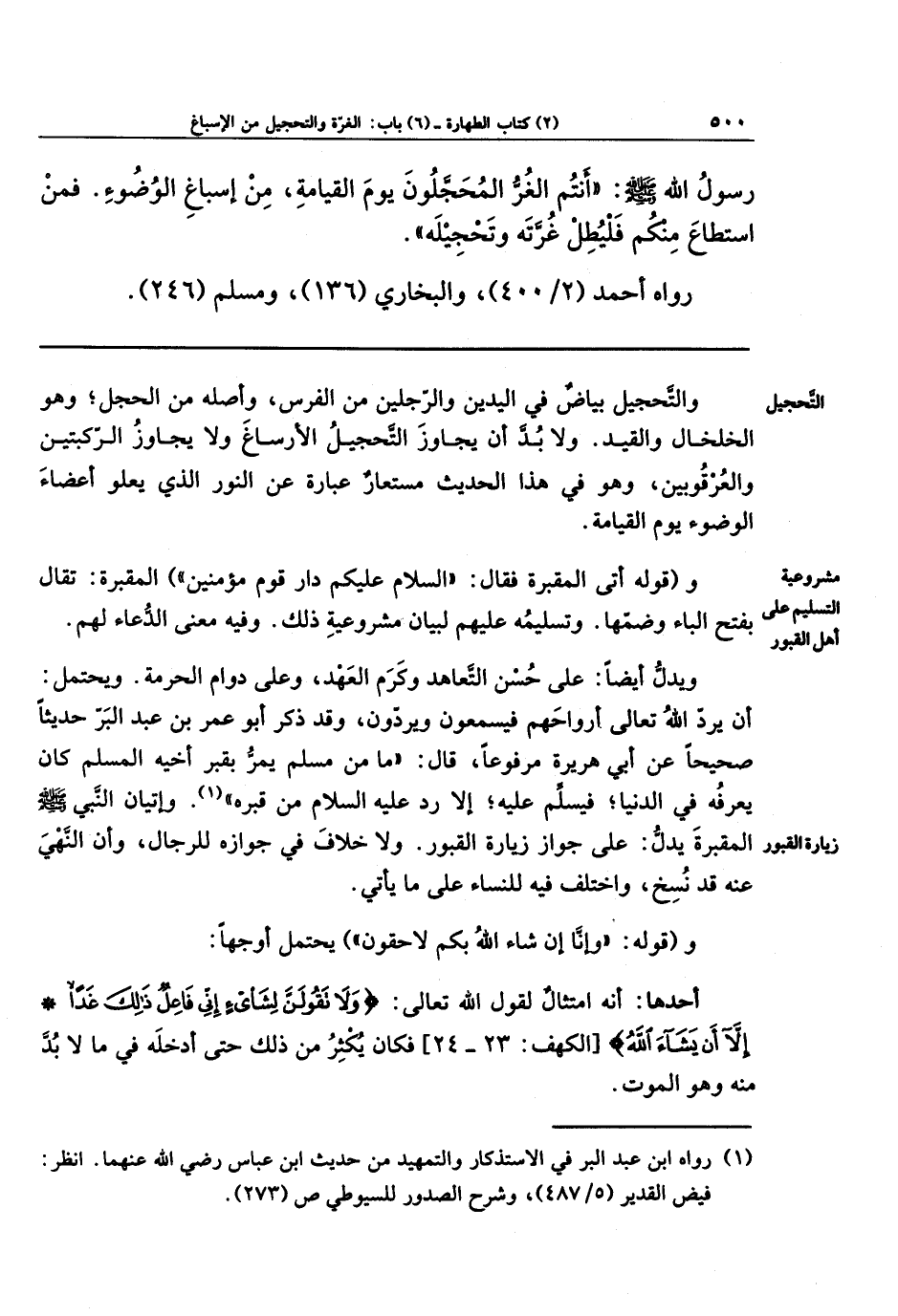 رَسُولُ اللهِ - صلى الله عليه وسلم -: أَنتُمُ الغُرُّ المُحَجَّلُونَ يَومَ القِيَامَةِ، مِن إِسبَاغِ الوُضُوءِ، فَمَنِ استَطَاعَ مِنكُم فَليُطِل غُرَّتَهُ وَتَحجِيلَهُ.