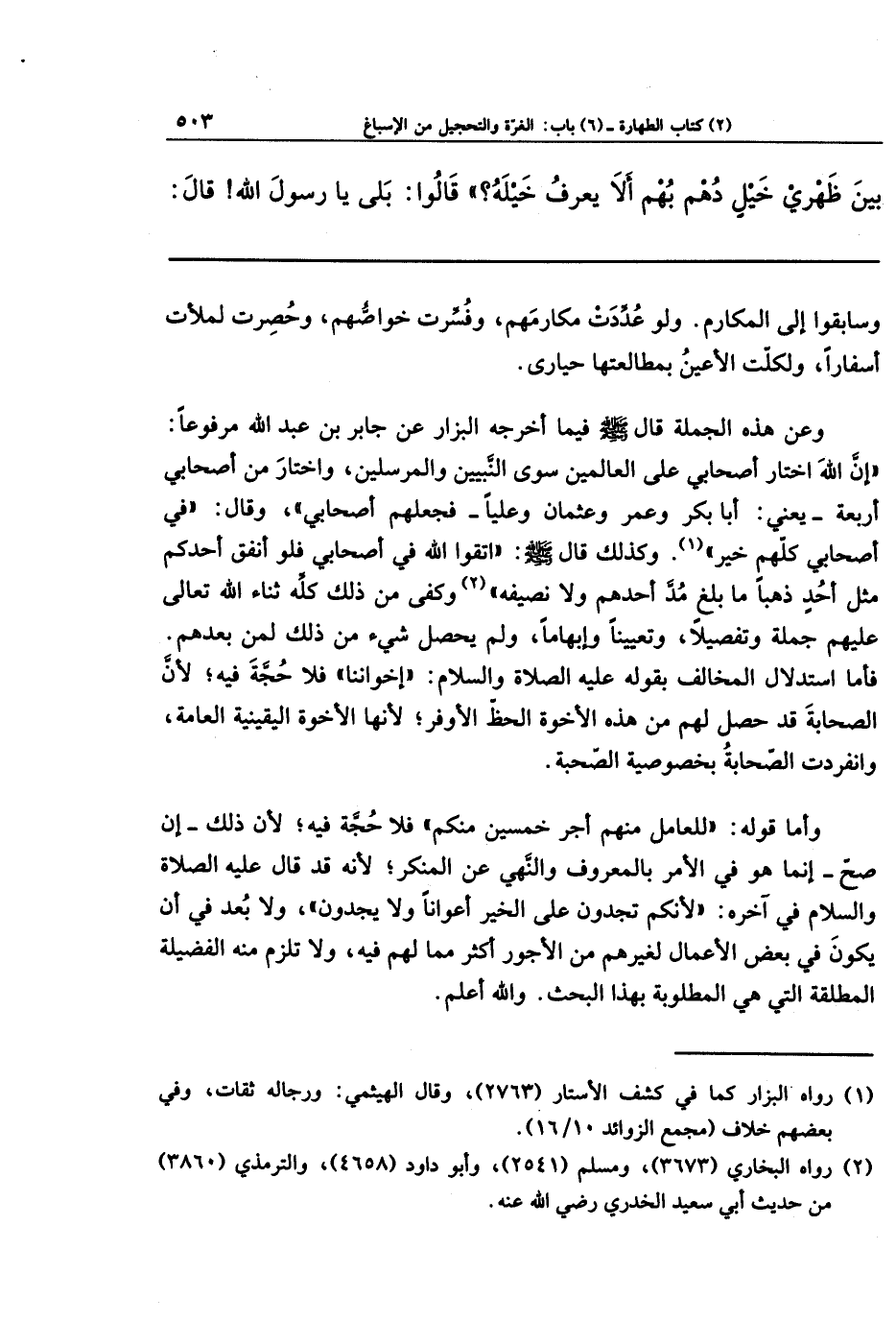 وأما قوله: للعامل منهم أجر خمسين منكم، فلا حجَّة فيه؛ لأن ذلك - إن صح - إنما هو في الأمر بالمعروف والنهي عن المنكر؛ لأنه قد قال - عليه الصلاة والسلام - في آخرِه: لأنكم تجدون على الخير أعوانًا ولا يجدون، ولا بُعد في أن يكون في بعض الأعمال لغيرهم من الأجور أكثر مما لهم فيه، ولا تلزم منه الفضيلة المطلقة التي هي المطلوبة بهذا البحث، والله أعلم.