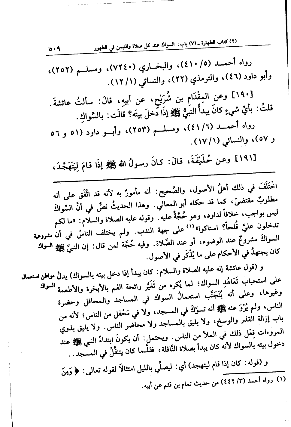 [190] وَعَنِ المِقدَامِ بنِ شُرَيحٍ؛ عَن أَبِيهِ؛ قَالَ: سَأَلتُ عَائِشَةَ. قُلتُ: بِأَيِّ شَيءٍ كَانَ يَبدَأُ النَّبِيُّ - صلى الله عليه وسلم - إِذَا دَخَلَ بَيتَهُ؟ قَالَت: بِالسِّوَاكِ.