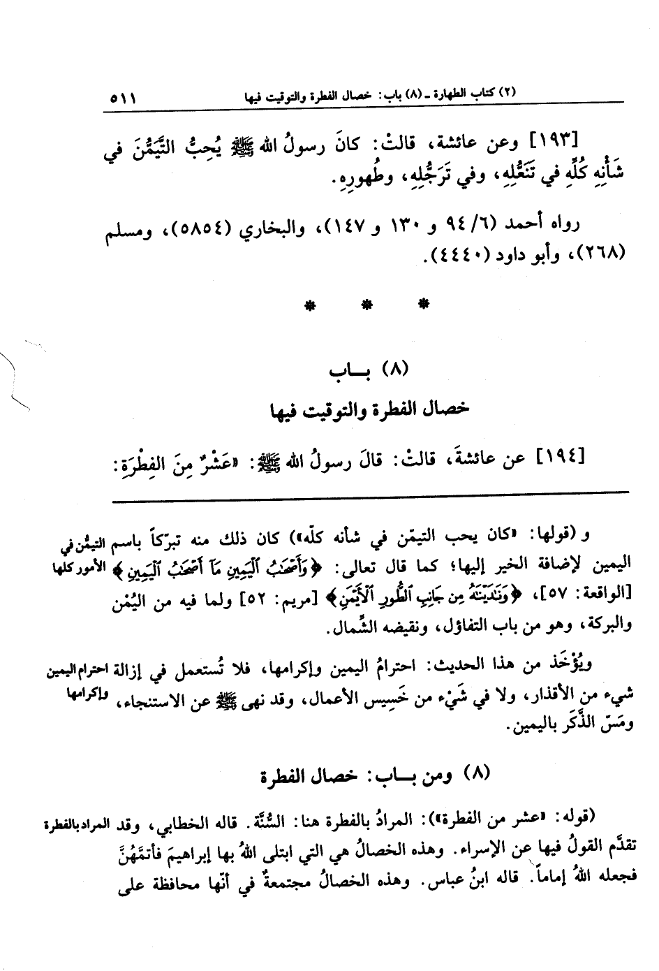 [194] عَن عَائِشَةَ؛ قَالَت: قَالَ رَسُولُ اللهِ - صلى الله عليه وسلم -: عَشرٌ مِنَ الفِطرَةِ: