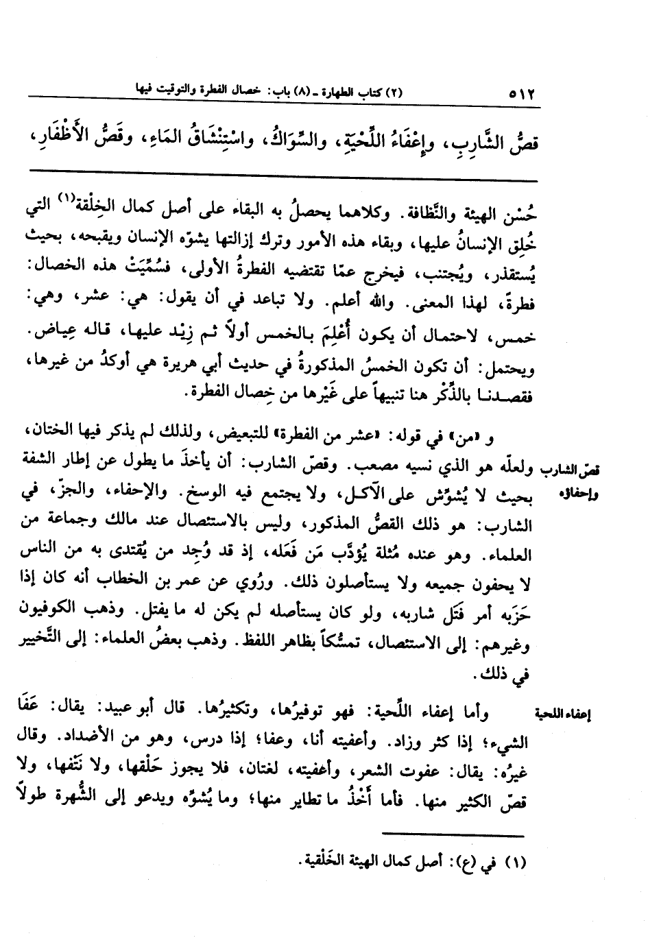 حسن الهيئة والنظافة، وكلاهما يحصل به البقاء على أصل كمال الخلقة (¬1) التي خلق الإنسان عليها، وبقاء هذه الأمور وترك إزالتها يشوه الإنسان ويقبحه، بحيث يُستقذر ويجتنب، فيخرج عما تقتضيه الفطرة الأولى، فسميت هذه الخصال: فطرة لهذا المعنى، والله أعلم.