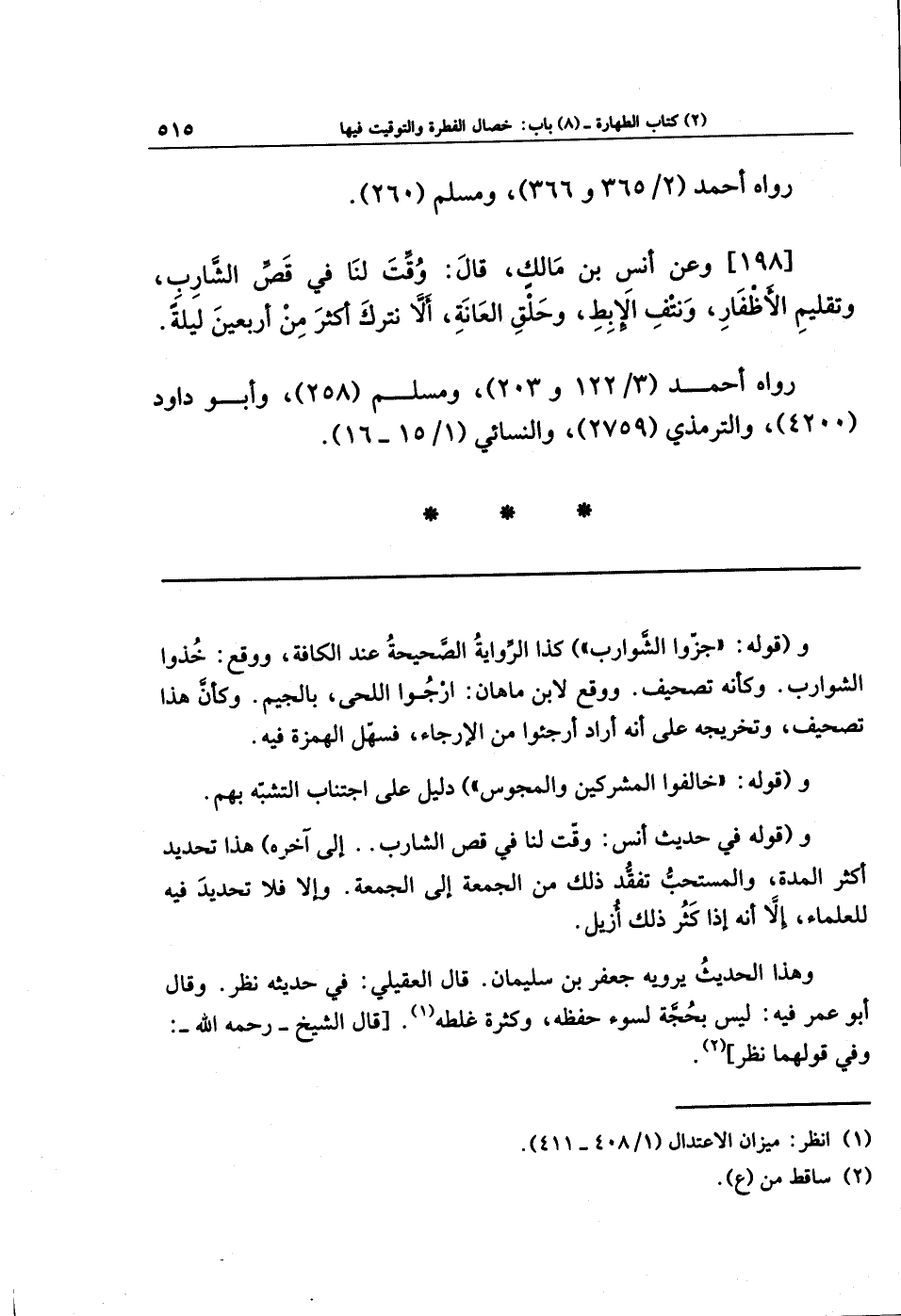 [198] وَعَن أَنَسِ بنِ مَالِكٍ؛ قَالَ: وُقِّتَ لَنَا فِي قَصِّ الشَّارِبِ، وَتَقلِيمِ الأَظفَارِ، وَنَتفِ الإِبِطِ، وَحَلقِ العَانَةِ، أَلا نُترَك أَكثَرَ مِن أَربَعِينَ لَيلَةً.