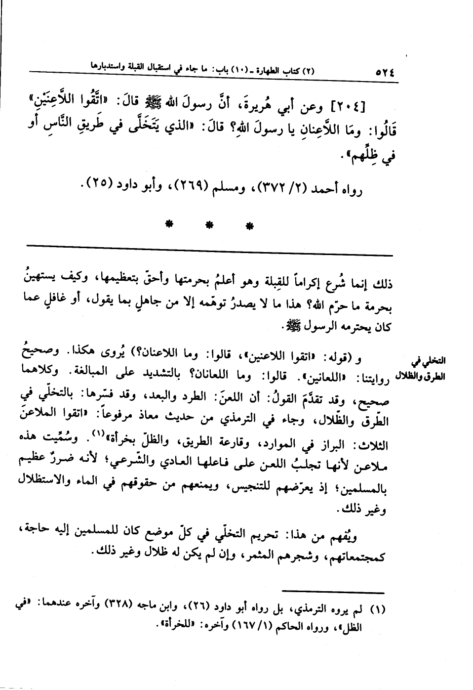 [204] وَعَن أَبِي هُرَيرَةَ؛ أَنَّ رسولَ الله - صلى الله عليه وسلم - قَالَ: اتَّقُوا اللاَّعَّنَينِ، قَالُوا: وَمَا اللاَّعَّنَانِ يَا رسولَ الله؟ قَالَ: الَّذِي يَتَخَلَّى فِي طَرِيقِ النَّاسِ أو فِي ظِلِّهِم.