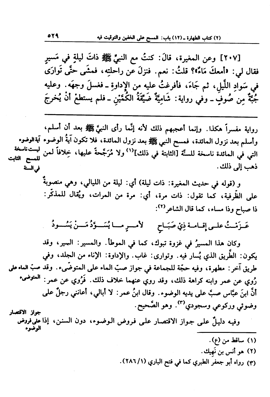 [207] وَعَنِ المُغِيرَةِ؛ قَالَ: كُنتُ مَعَ النَّبِيِّ - صلى الله عليه وسلم - ذَاتَ لَيلَةٍ فِي مَسِيرٍ فَقَالَ لِي: أَمَعَكَ مَاءٌ؟ قُلتُ: نَعَم. فَنَزَلَ عَن رَاحِلَتِهِ، فَمَشَى حَتَّى تَوَارَى فِي سَوَادِ اللَّيلِ، ثُمَّ جَاءَ، فَأَفرَغتُ عَلَيهِ مِنَ الإِدَاوَةِ، فَغَسَلَ وَجهَهُ، وَعَلَيهِ جُبَّةٌ مِن صُوفٍ - وَفِي رِوَايَةٍ: شَامِيَّةٌ ضَيِّقَةُ الكُمَّينِ - فَلَم يَستَطِع أَن يُخرِجَ