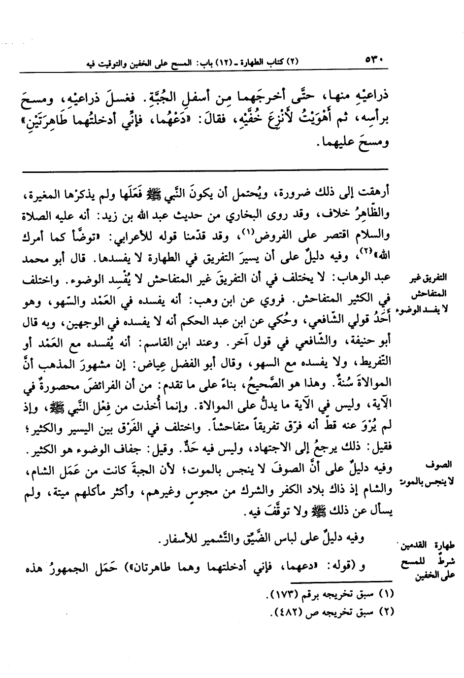 واختلف في الفرق بين اليسير والكثير؛ فقيل: ذلك يرجع إلى الاجتهاد، وليس فيه حدٌّ، وقيل: جفاف الوضوء هو الكثير. وفيه دليلٌ على أن الصوف لا ينجس بالموت؛ لأن الجبة كانت من عمل الشام، والشام إذ ذاك بلاد الكفر والشرك من مجوس وغيرهم، وأكثر مأكلهم ميتة، ولم يسأل عن ذلك - صلى الله عليه وسلم - ولا توقف فيه.