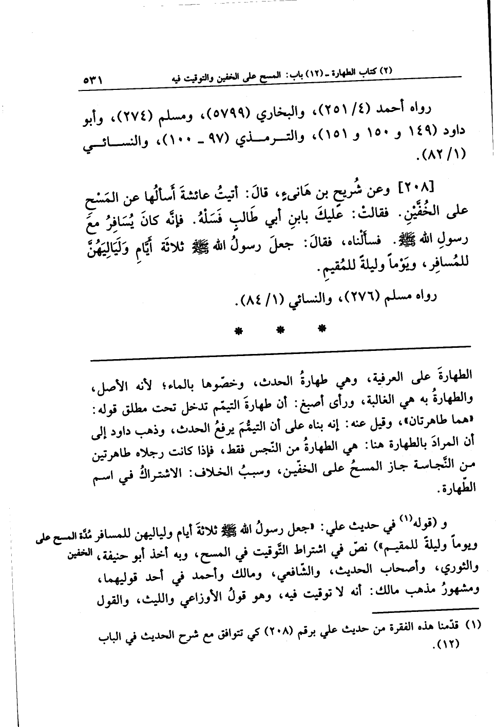 [208] وَعَن شُرَيحِ بنِ هَانِئٍ؛ قَالَ: أَتَيتُ عَائِشَةَ أَسأَلُهَا عَنِ المَسحِ عَلَى الخُفَّينِ. فَقَالَت: عَلَيكَ بِابنِ أَبِي طَالِبٍ فَسَلهُ. فَإِنَّهُ كَانَ يُسَافِرُ مَعَ رَسُولِ اللهِ - صلى الله عليه وسلم -. فَسَأَلنَاهُ، فَقَالَ: جَعَلَ رَسُولُ اللهِ - صلى الله عليه وسلم - ثَلاثَةَ أَيَّامٍ وَلَيَالِيَهُنَّ لِلمُسَافِرِ، وَيَومًا وَلَيلَةً لِلمُقِيمِ.