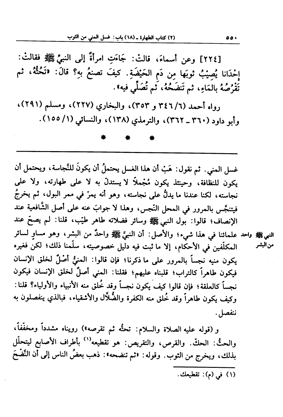 غسل المني، ثم نقول: هب أن هذا الغسل يحتمل أن يكون للنجاسة، ويحتمل أن يكون للنظافة، وحينئذ يكون مجملاً لا يستدل به لا على طهارته، ولا على نجاسته، لكنا عندنا ما يدل على نجاسته، وهو أنه يمر في ممر البول، ثم يخرج فيتنجس بالمرور في المحل النجس، وهذا لا جواب عنه على أصل الشافعية عند الإنصاف.